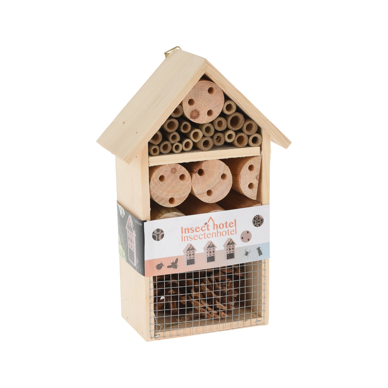 Leseni hotel za žuželke je praktičen dodatek za vsak vrt, balkon ali sadovnjak. Ponuja varne skrivališča za samotarske čebele, pikapolonice, tenčičarice in druge koristne žuželke, ki pomagajo pri opraševanju in naravnem varstvu pred škodljivci. Zaradi premišljene strukture komor in naravnih materialov je idealen za poletno zavetje in prezimovanje.