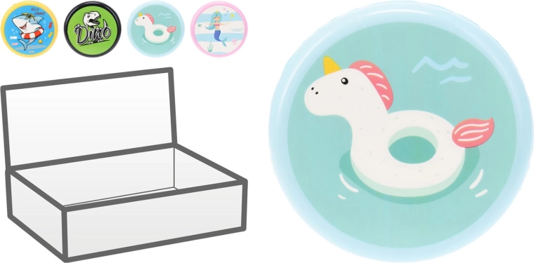 Uživajte v poletni zabavi s tem letečim diskom za vodo s premerom 20 cm. Lahka in trpežna izdelava iz poliuretana zagotavlja udobno metanje tudi za otroke. Stilska mešanica motivov (morska deklica, samorog, dinozaver, morski pes) bo navdušila male in velike ljubitelje aktivne igre ob vodi.