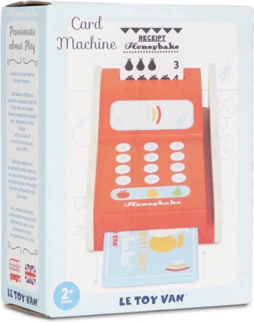 Otroški plačilni terminal iz masivnega kavčukovega lesa dopolni vsako kuhinjico ali trgovinico. Zahvaljujoč realističnemu videzu, gumbom in reži za kartico si otroci urijo socialne veščine, komunikacijo in prve račune. Igrača je trdna, vzdržljiva in zasnovana tako, da prenese vsakodnevno igro.