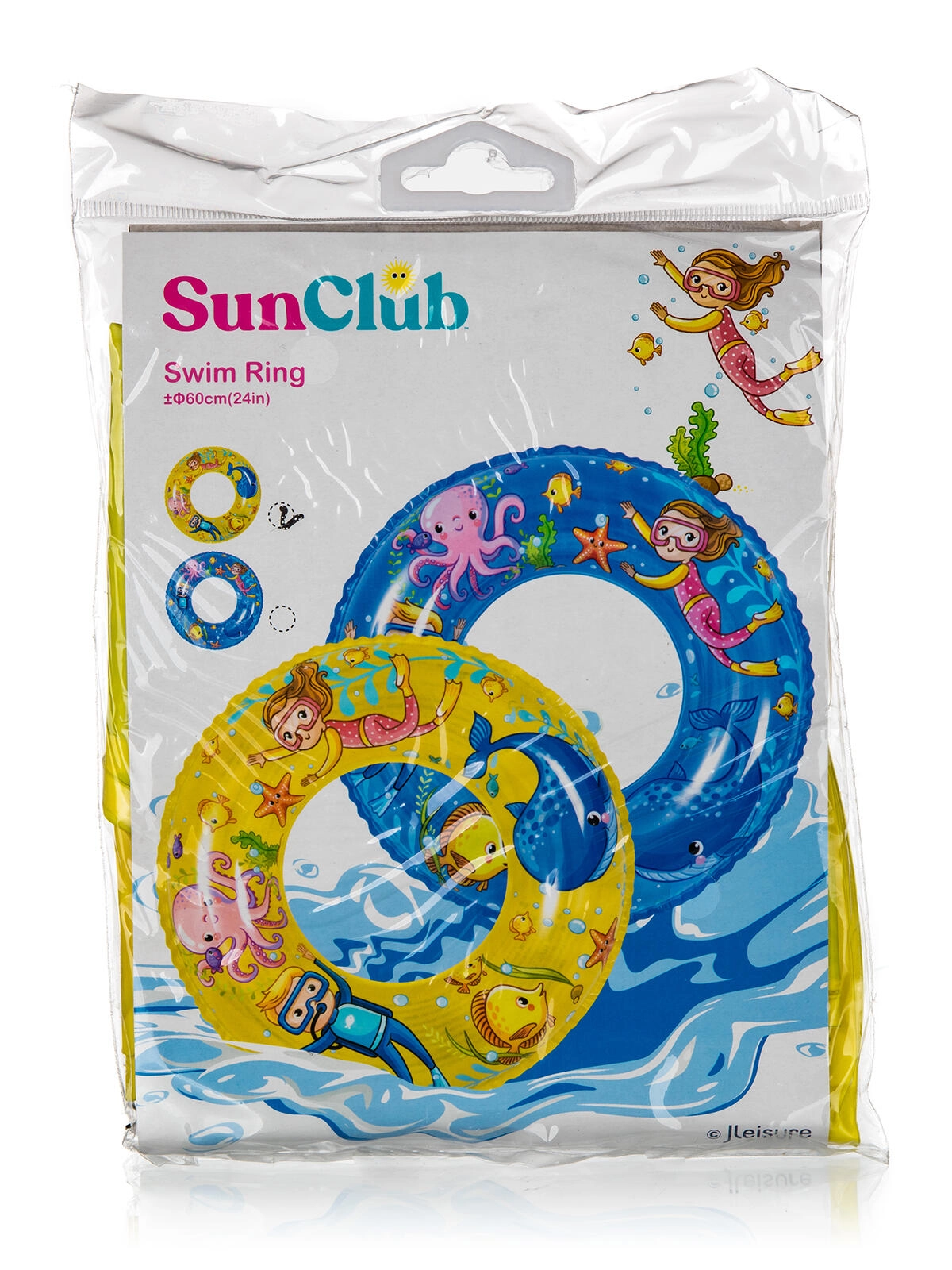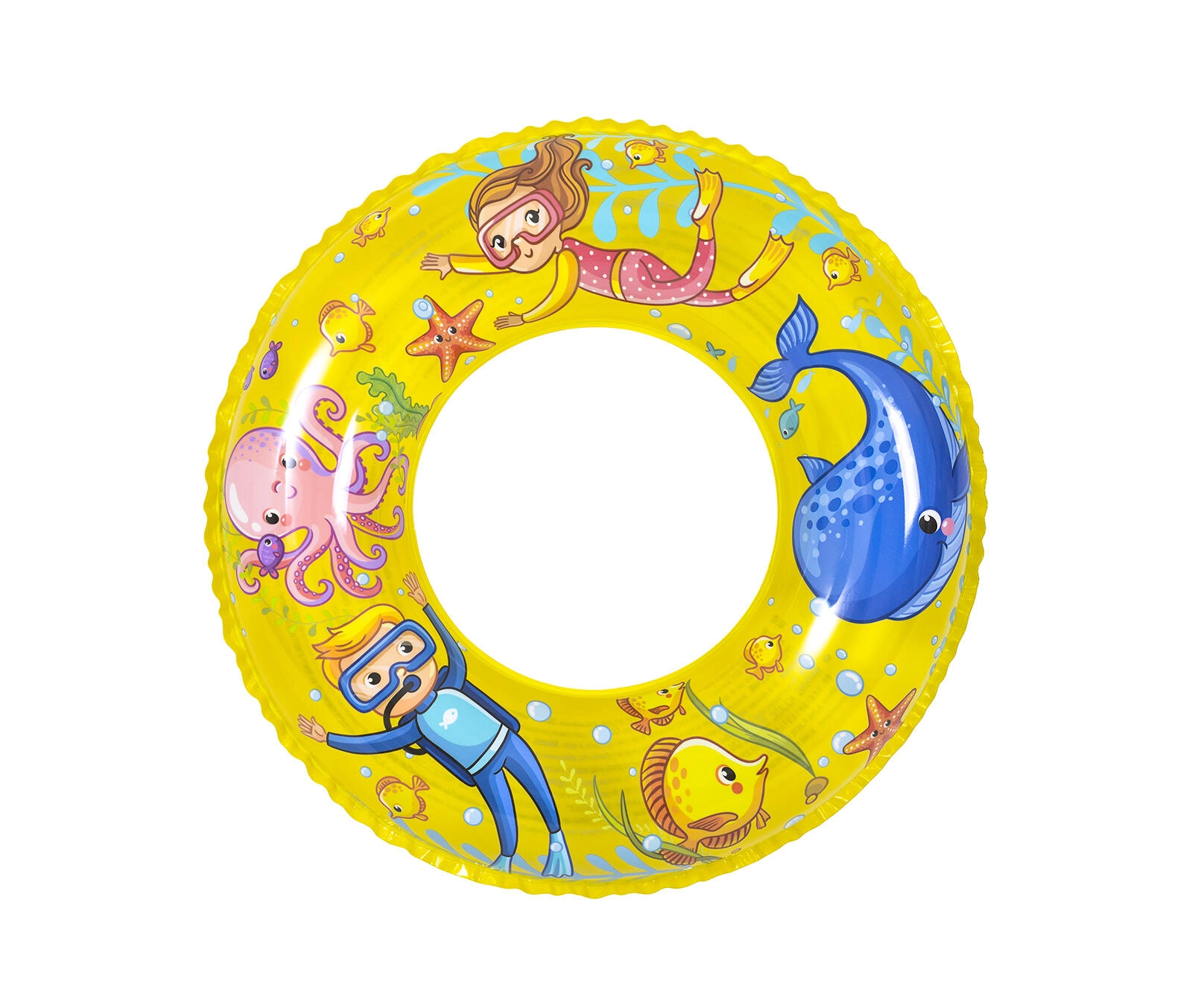 Uživajte poletje z otroškim napihljivim obročem s premerom 60 cm iz trpežnega vinila, idealnim za vodne vragolije. Veseli podvodni potiski in dve barvni različici (modra in rumena) navdušita vsakega otroka. Obroč zagotavlja stabilno plovnost, udoben oprijem in je primeren za otroke približno 4–8 let.