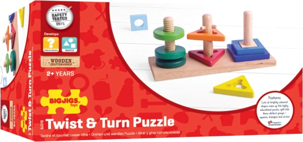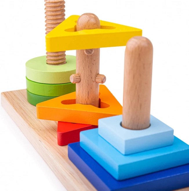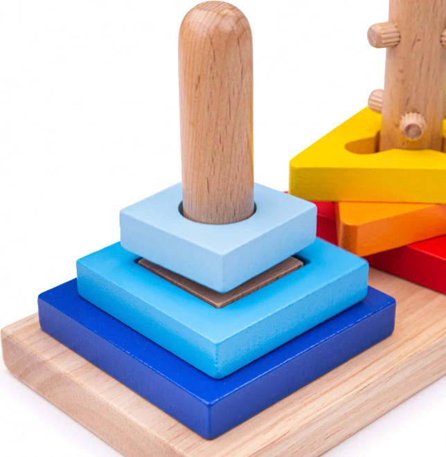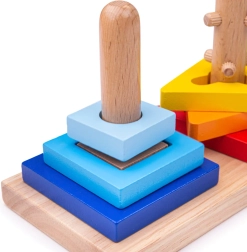 Ta pametna lesena igrača otroke spodbuja k raziskovanju. Koščki se nameščajo na tri različne količke, pri čemer nekateri zahtevajo vrtenje ali pravilno usmeritev. Otroci tako naravno urijo spretnost prstov, potrpežljivost in prostorsko predstavljivost.
