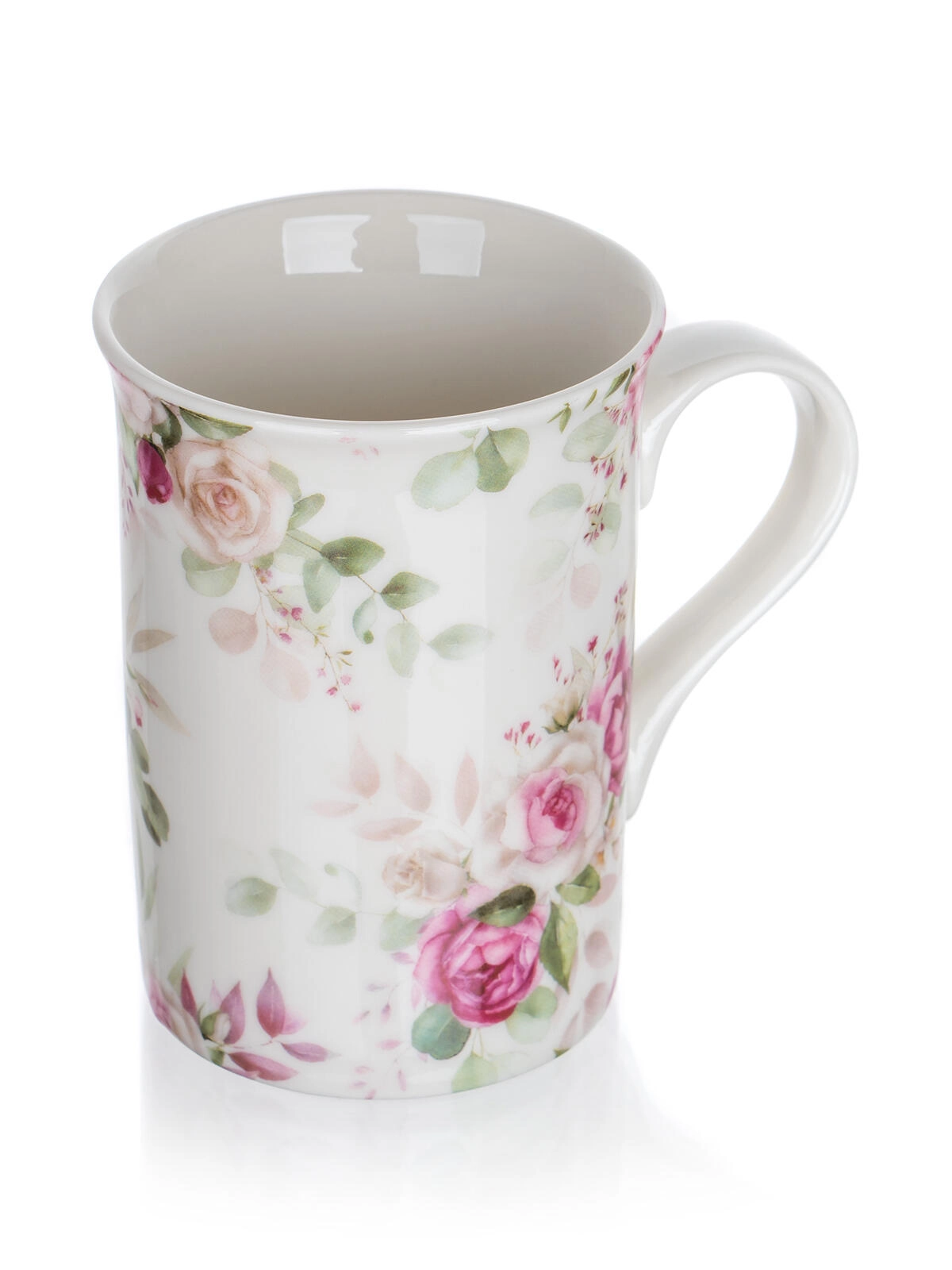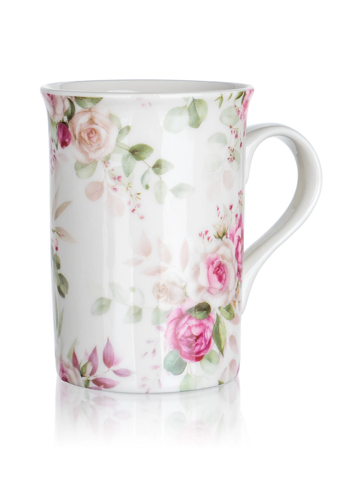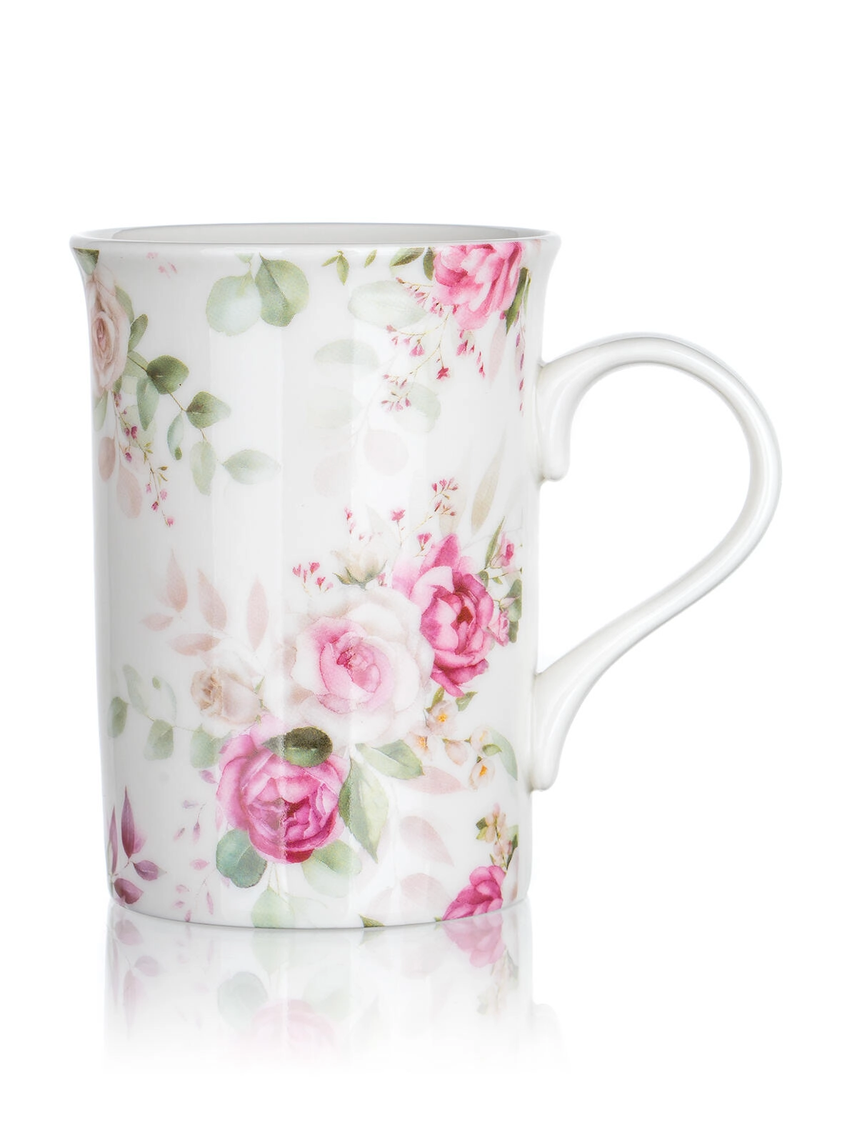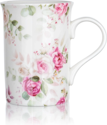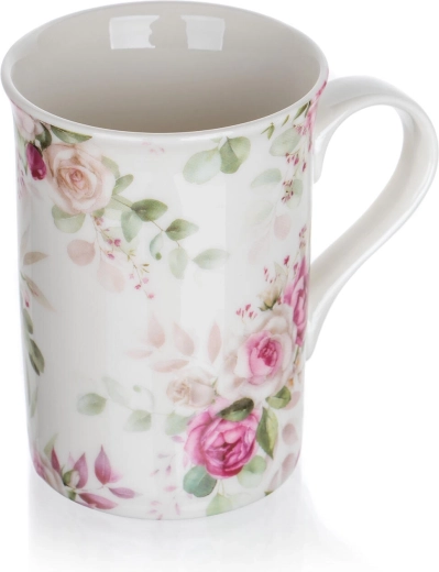 Prostorna keramična skodelica z udobnim ročajem in cvetličnim motivom vrtnic je idealna za čaj ali kavo. Pijačo ohranja prijetno toplo in lepo sede v roko.