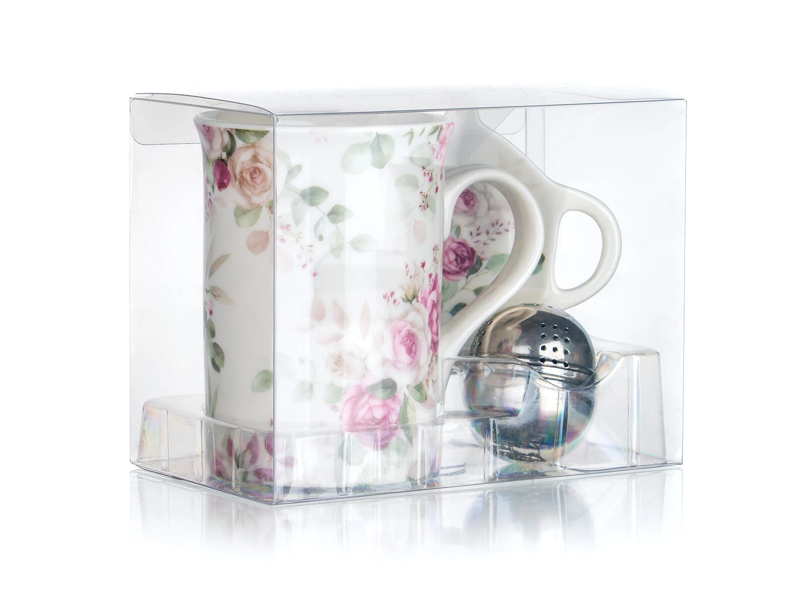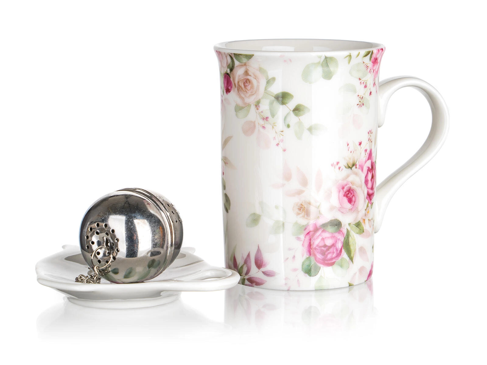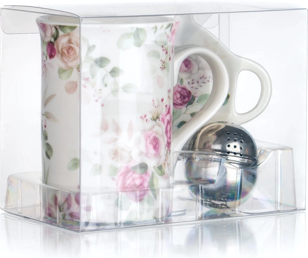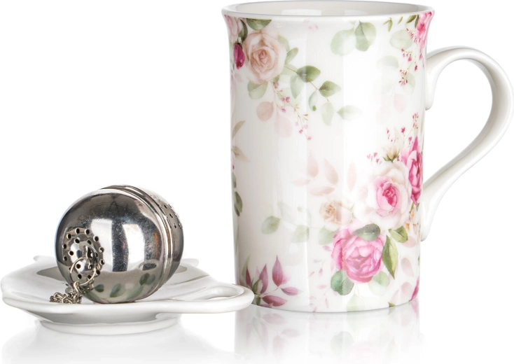 Ta romantičen čajni set z motivom vrtnic prinese vašim čajnim premorom šarm in udobje. Prostorna skodelica s prostornino 340 ml je idealna za jutranji čaj ali popoldansko kavo, nerjaveče jekleno cedilo poskrbi za čist preliv iz rahlosipanih mešanic, keramični krožniček pa ohranja mizo brez kapljic.