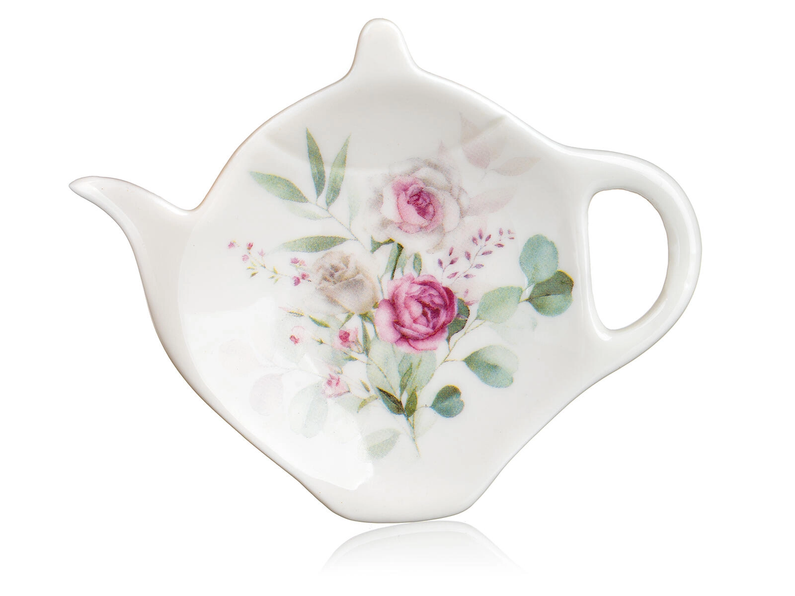 Praktičen majhen krožniček v obliki čajnika služi za odlaganje cedila po namakanju. Ohranija delovno površino čisto in se sklada s cvetličnim dekorjem skodelice.