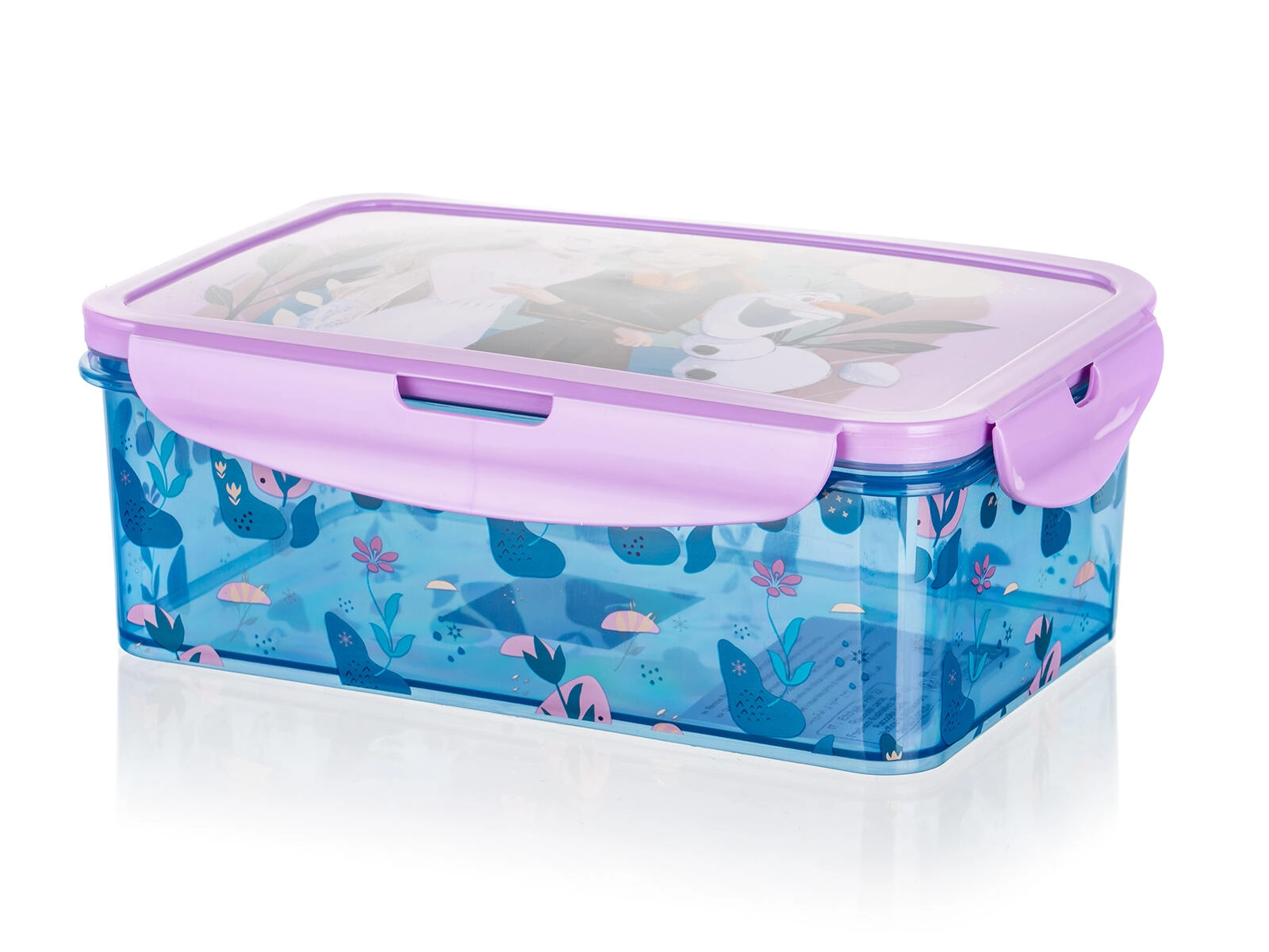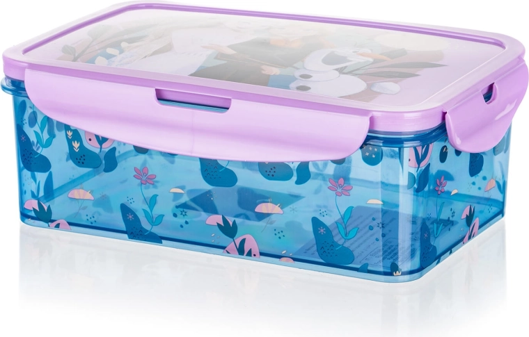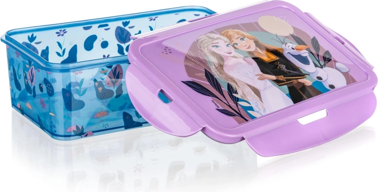 Praktična škatla za malico z priljubljenim motivom FROZEN ohranja hrano svežo in varno zaprto zahvaljujoč trdnemu zapiranju s sponko in silikonskemu tesnilu. Idealna za šolo in izlete, ponuja prostornino 1,19 l ter kompaktne mere za enostavno prenašanje.