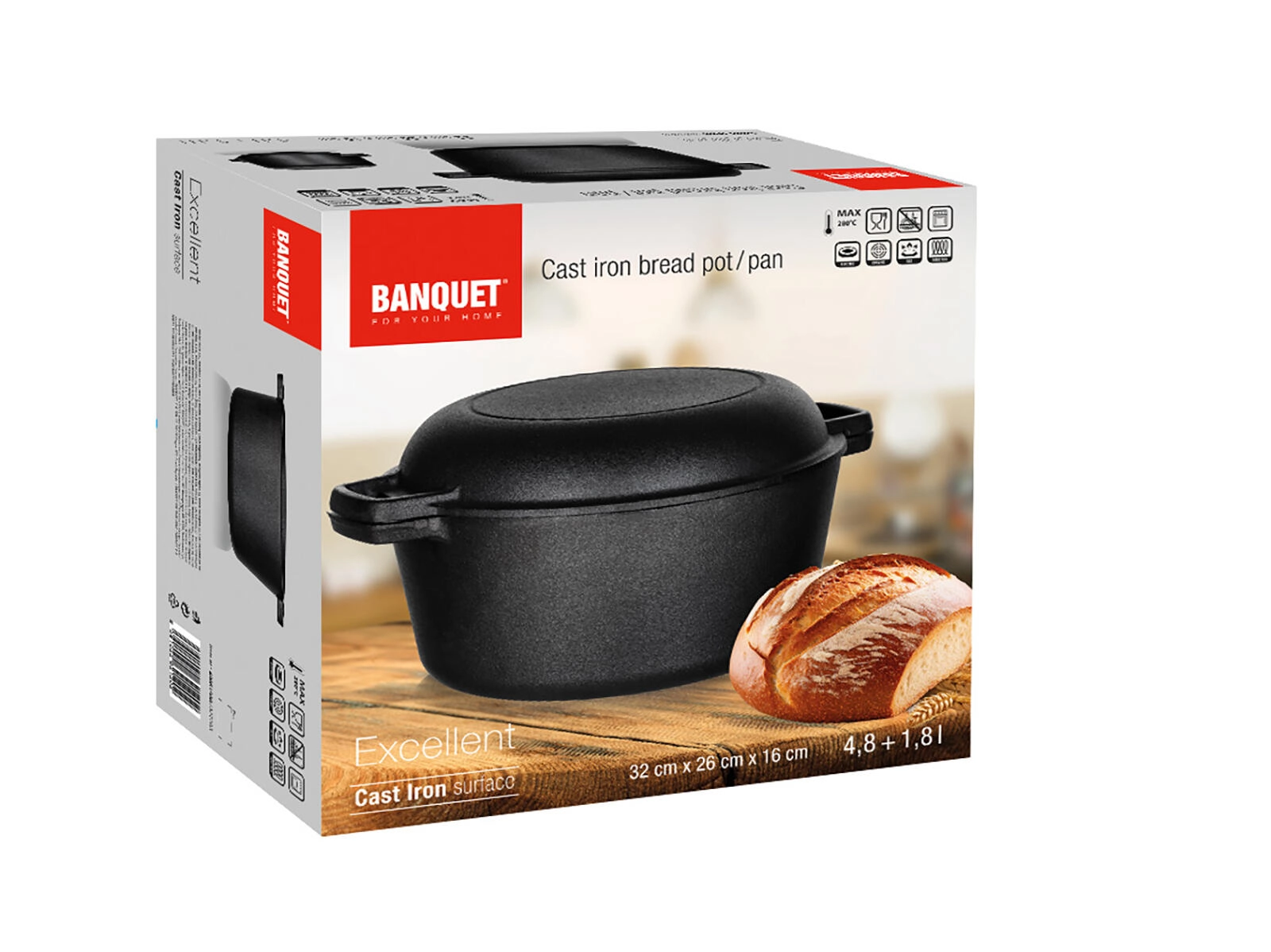 Odkrijte vsestranski litoželezni lonec EXCELLENT, ki obvlada vse od domačega kruha do dišečih pečenk. Masivno lito železo se hitro in enakomerno segreje ter dolgo zadržuje toploto, zato kuhate varčneje in z zanesljivimi rezultati. Pokrov z lastno prostornino 1,8 l služi tudi kot samostojna ponev za cvrtje ali nizek pekač za zapekanje.