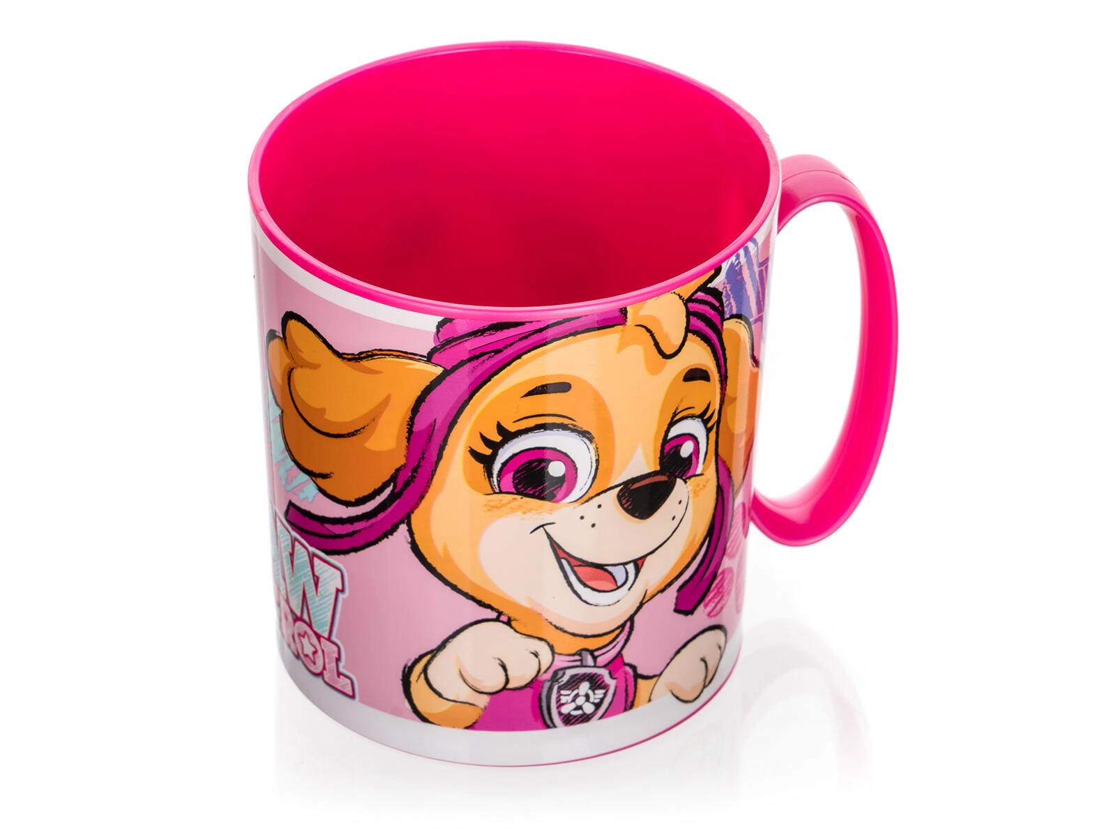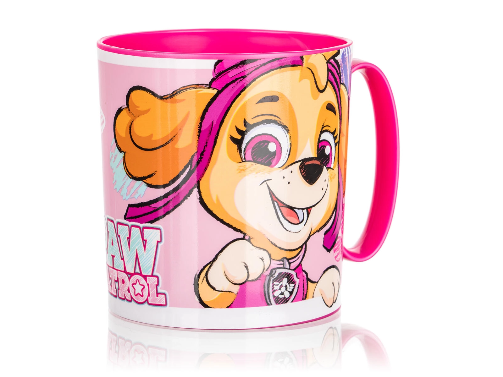 Lonček ima prostornino 350 ml, zato je popoln za vodo, čaj, kakav in sok. Material je varen in neoporečen, lonček pa je mogoče tudi na kratko segreti v mikrovalovni pečici (največ 2 minuti pri 600 W). Rožnat dizajn z veselo grafiko Skye bo poskrbel za veselje pri vsakem požirku.