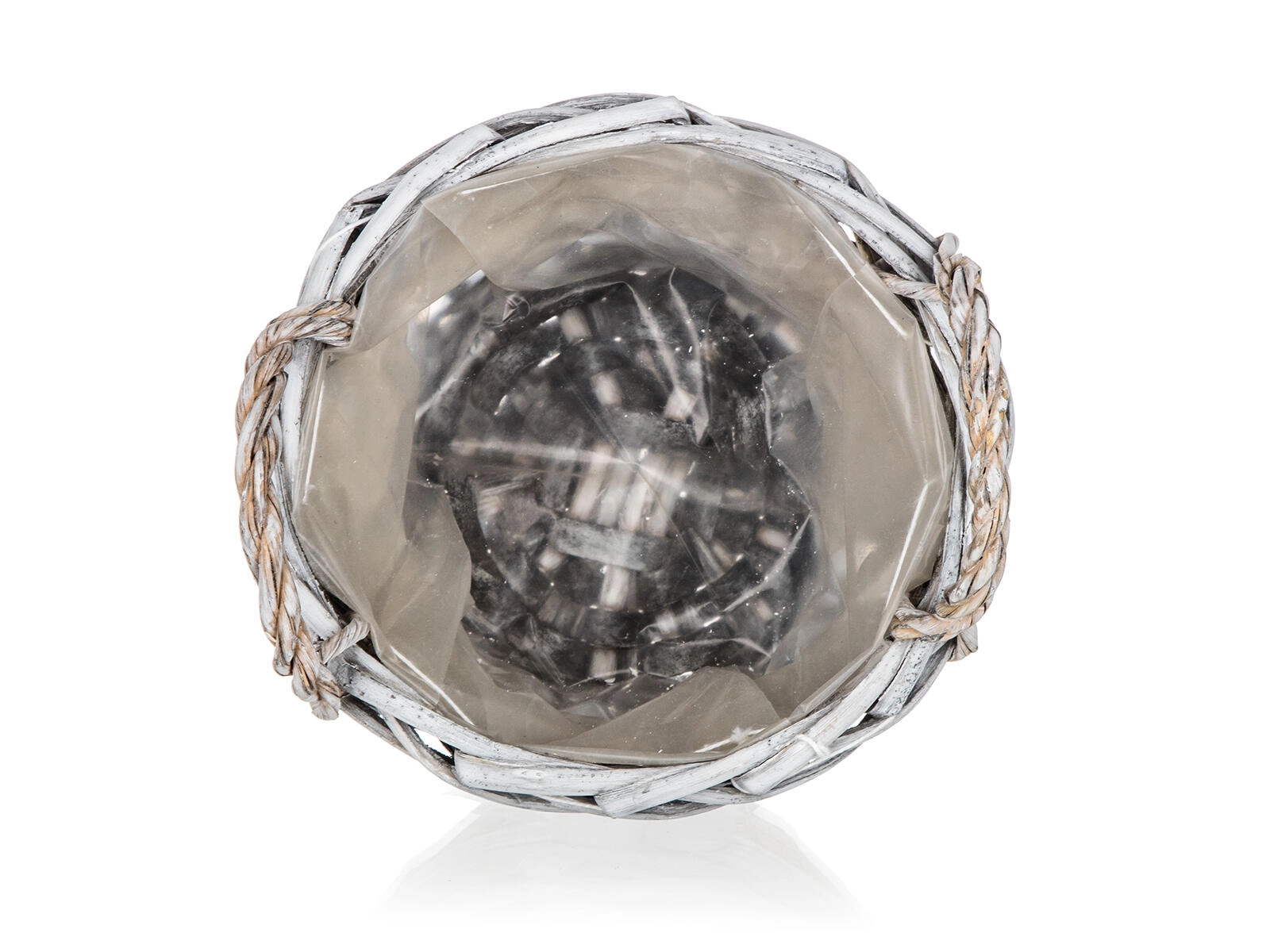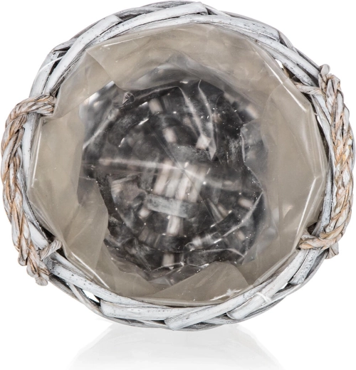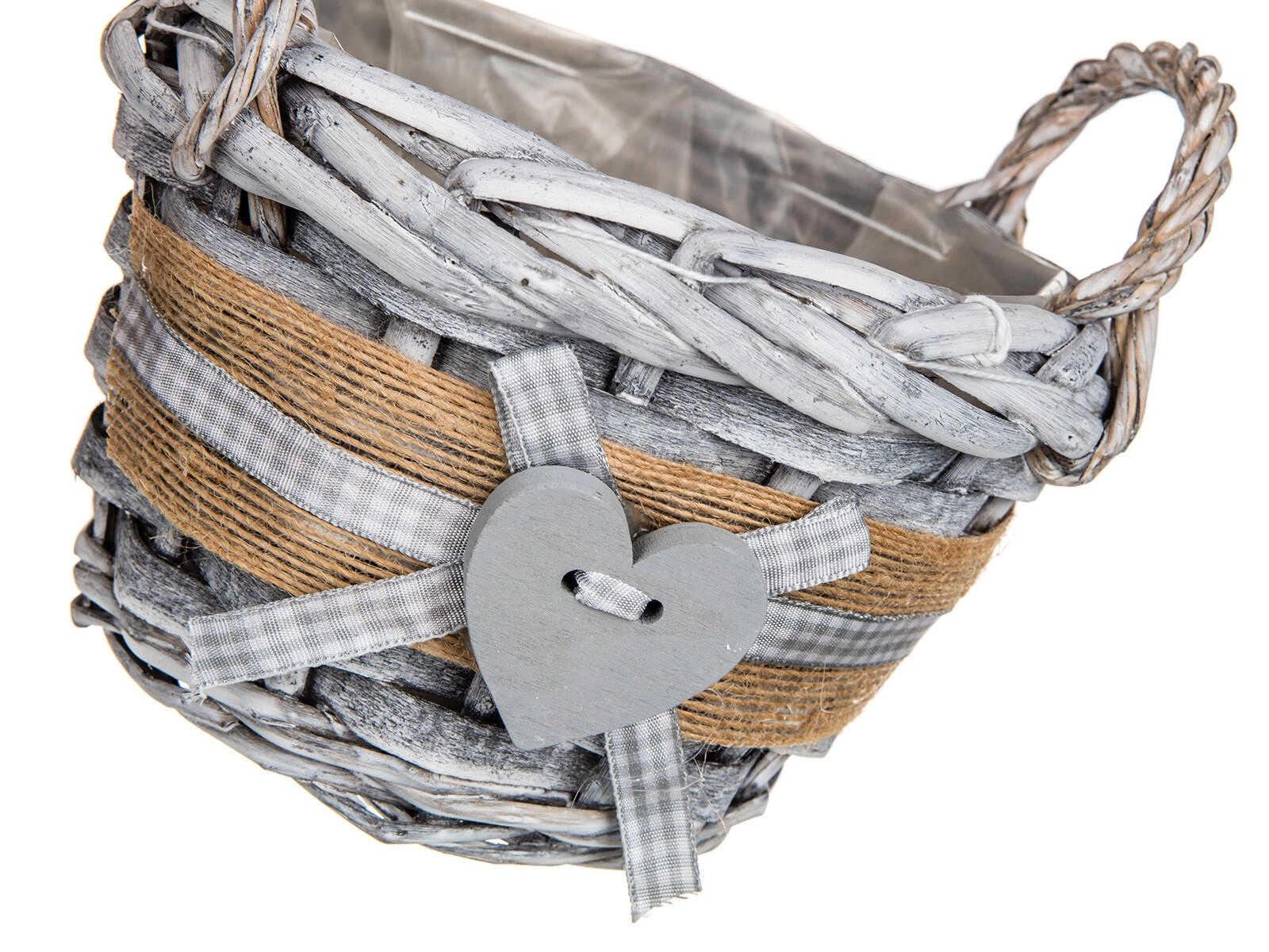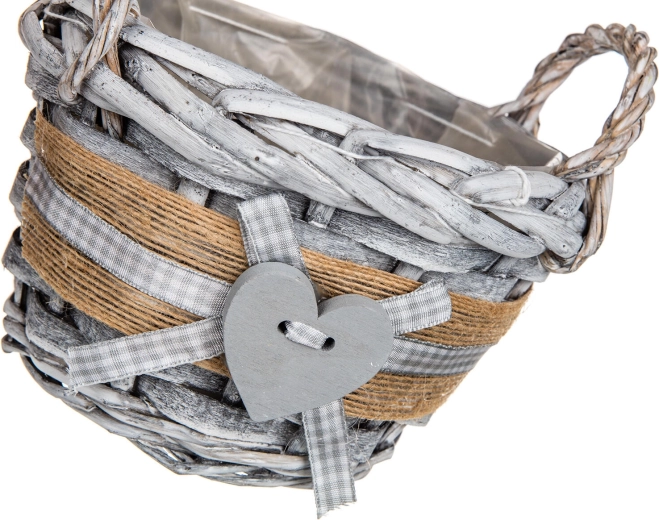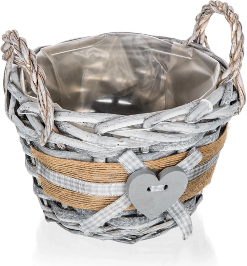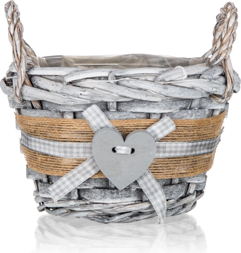 Ta okrogla pletena košara GRIS v notranjost vnese prijetno, naravno vzdušje. Sivo patinirana izvedba z jutastim trakom, kariranim trakom in dekorativnim srcem jo naredi za stilski dodatek za dnevno sobo, predsobo ali kuhinjo. Notranja plastična vložka ščiti površino in omogoča varno aranžiranje dekoracij brez tveganja za vlago.