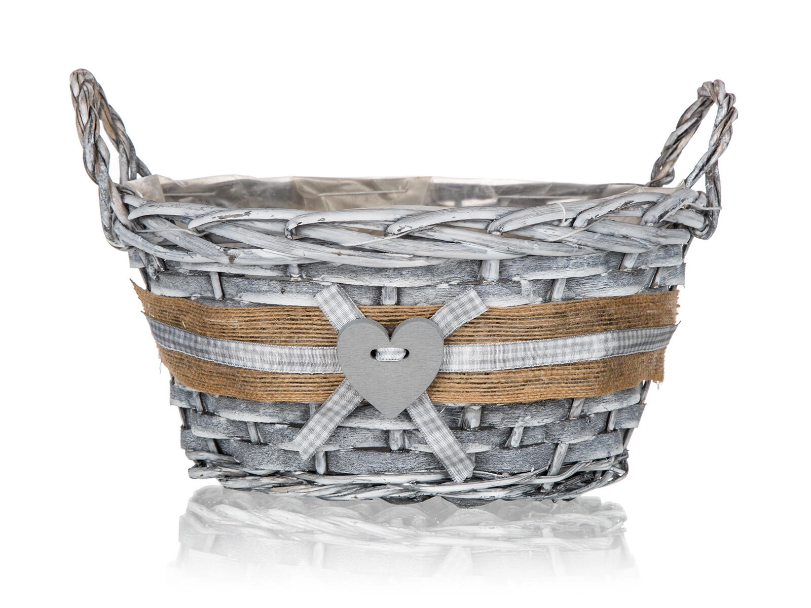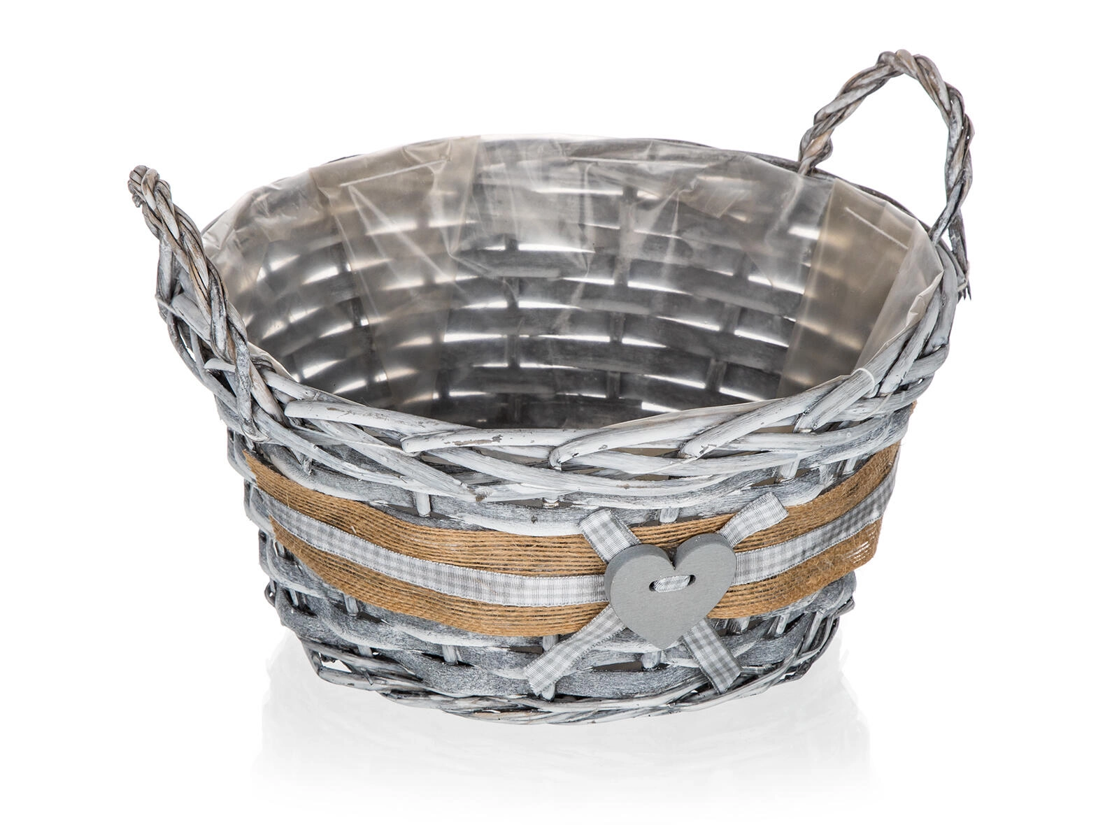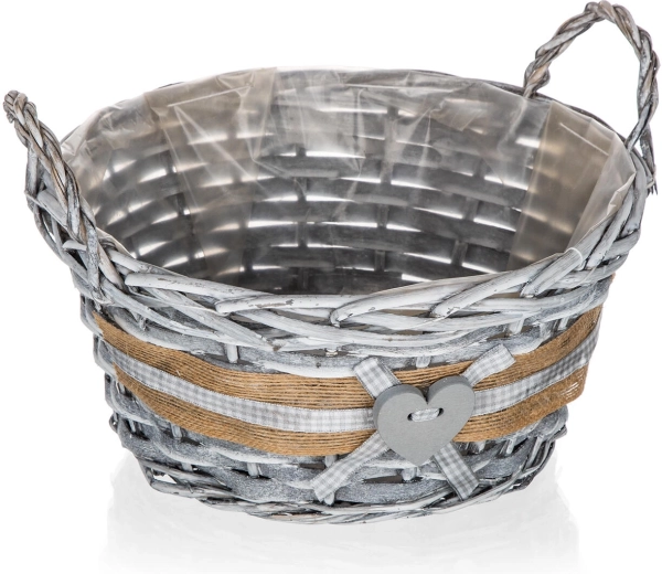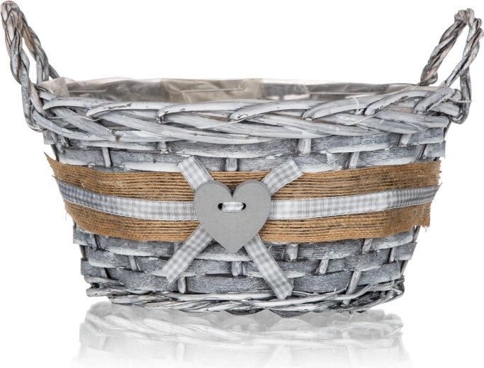 Sivo pletenje z jutastim trakom, karo mašno in srčkom daje košu izviren videz, ki odlično dopolni tako moden kot podeželski slog.