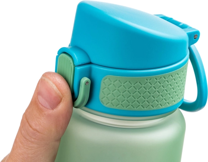 Pokrovček z gumbom in drsnim zaklepom zagotavlja tesnjenje proti razlitju in varno prenašanje v nahrbtniku ali torbici.