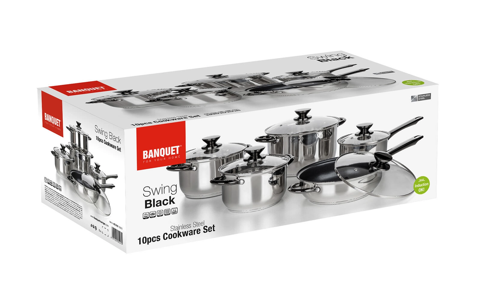 Kompleten 10-delni set posode SWING Black iz kakovostnega nerjavečega jekla za vsakodnevno kuhanje. Vsebuje lonce, kozico in ponev z neprijemljivo površino, vse z odpornimi steklenimi pokrovi z odprtino za paro. Primerna za vse vrste štedilnikov, vključno z indukcijo, z sijočo obdelavo in elegantnimi bakrenimi detajli. Enostavno vzdrževanje, primerno za pomivalni stroj.