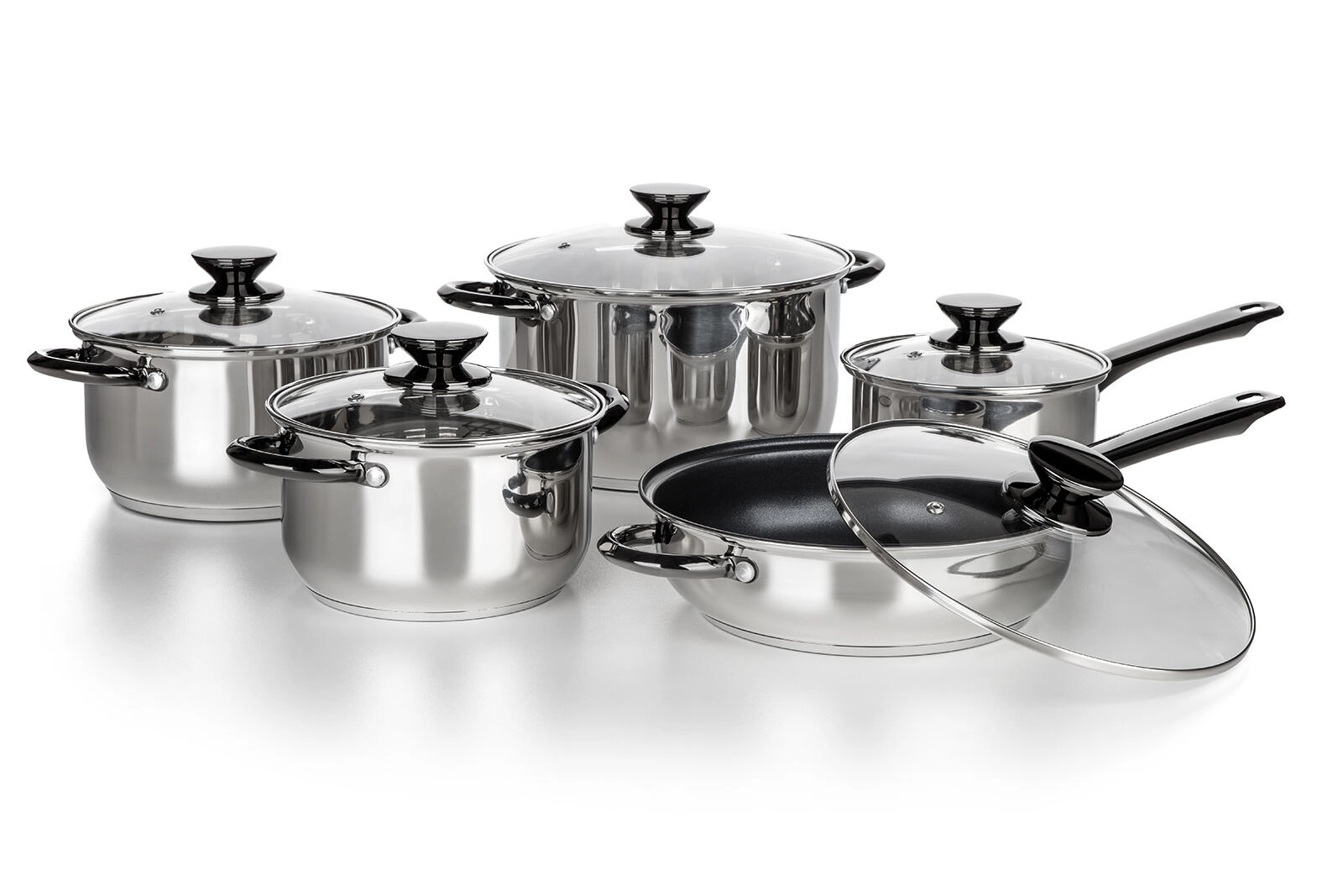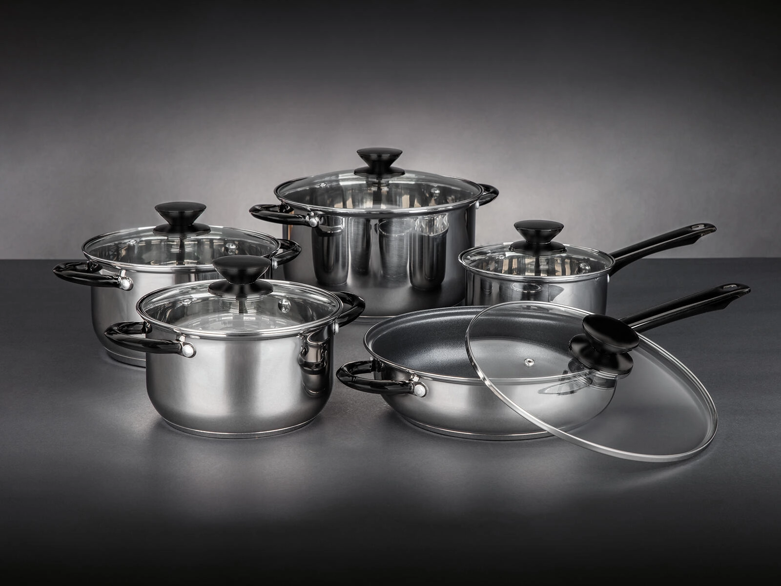 - Kozica 16 × 9 cm s pokrovom; lonec 18 × 10,5 cm s pokrovom; lonec 20 × 11,5 cm s pokrovom; lonec 24 × 13,5 cm s pokrovom; ponev 24 × 6,5 cm z neprijemljivo površino in pokrovom