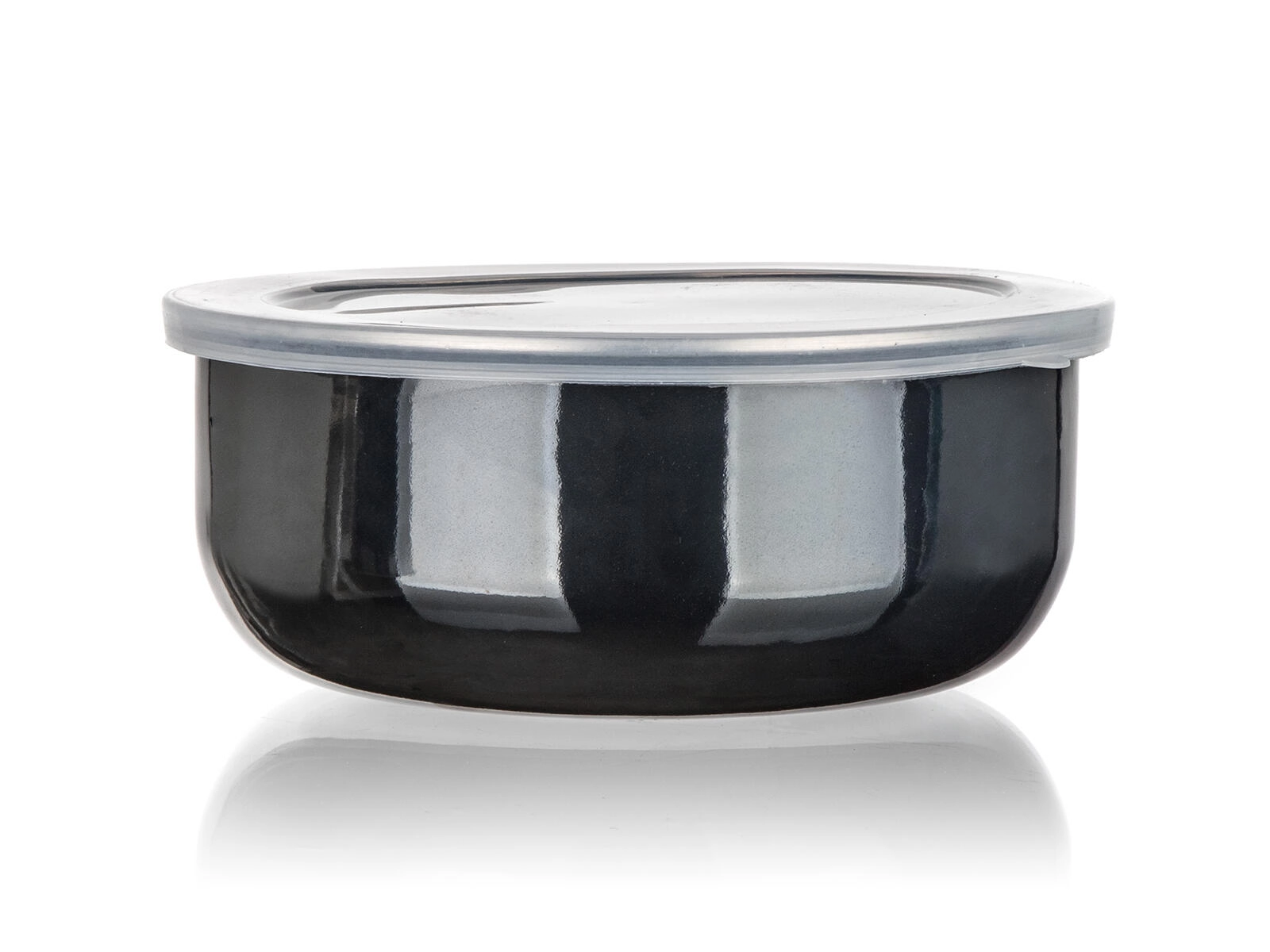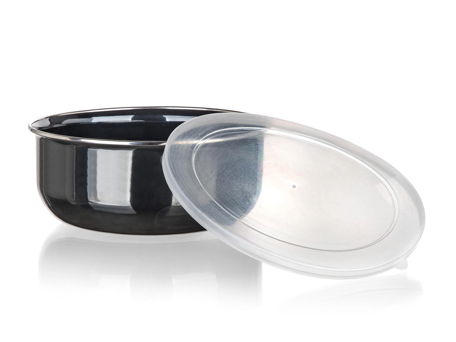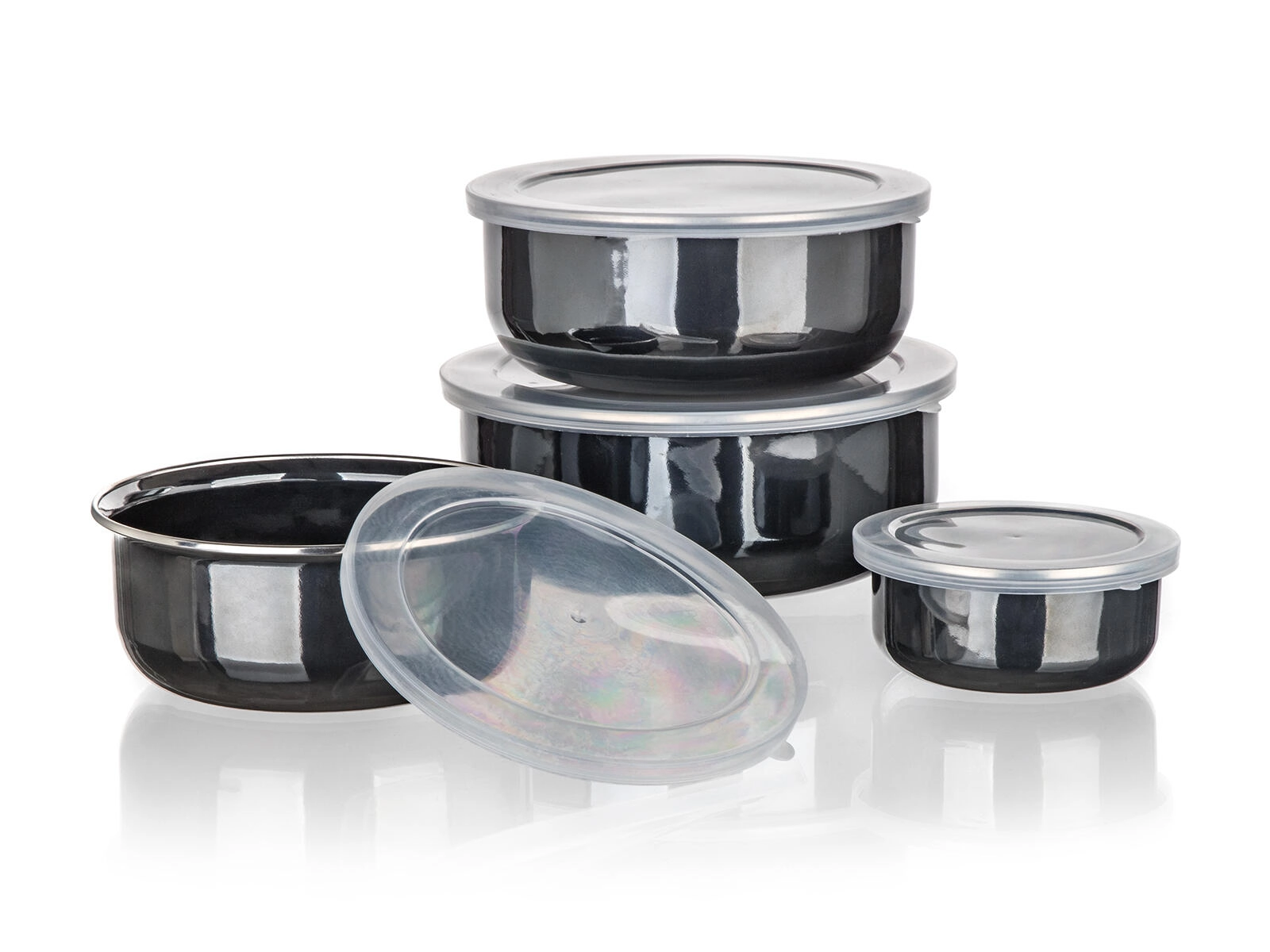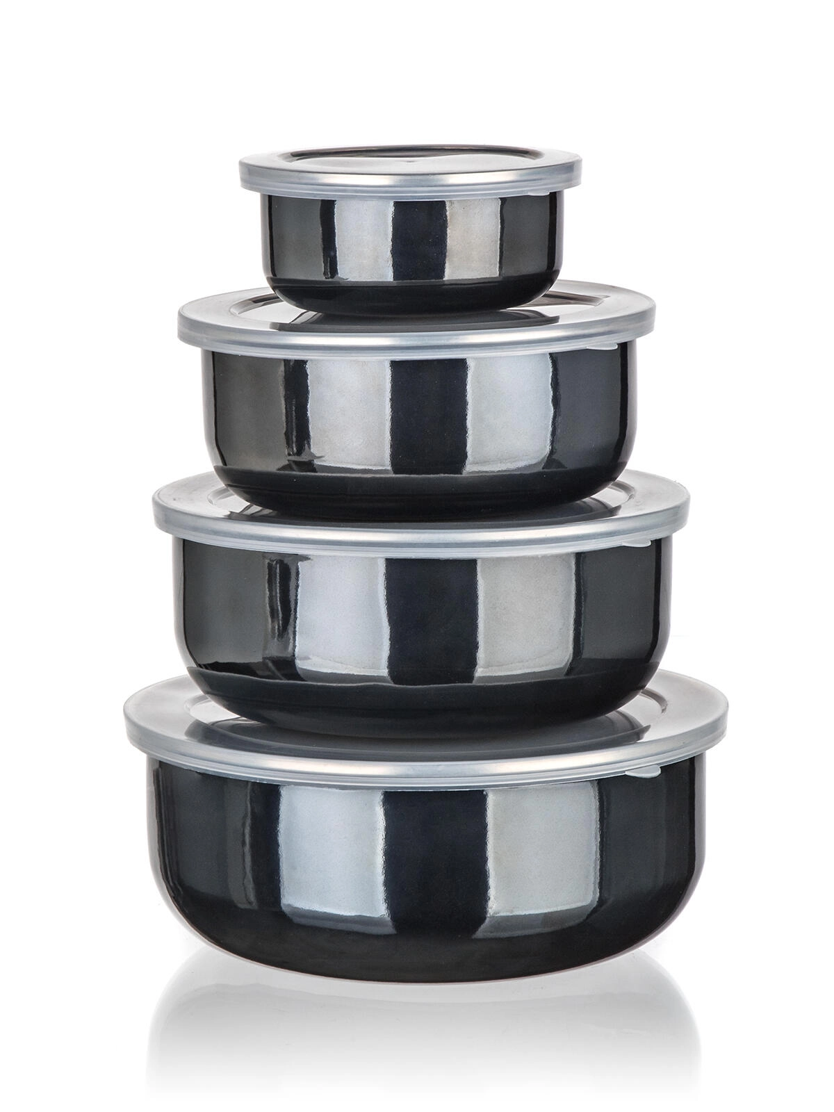 Praktičen set emajliranih skled s plastičnimi pokrovi METALIC Black v elegantni črni barvi za vsakodnevno uporabo. Štiri velikosti z zlaganjem ena v drugo prihranijo prostor, tesnilni pokrovi pomagajo ohranjati živila dlje sveža, vzdržljiv emajl pa zagotavlja enostavno vzdrževanje. Idealno za shranjevanje živil v hladilniku in na poti.