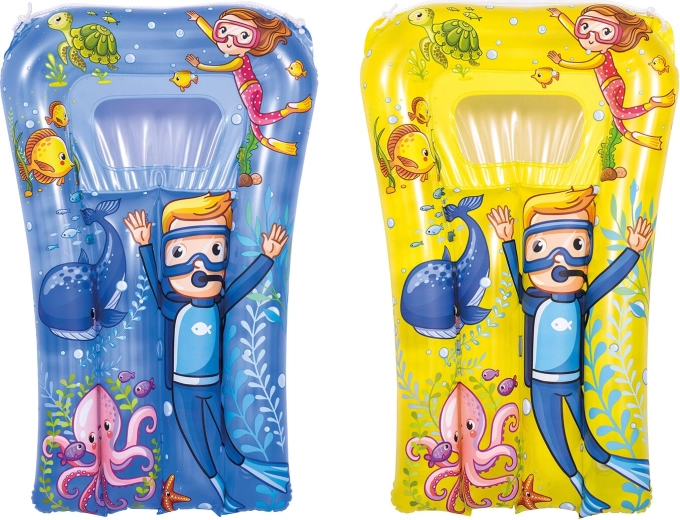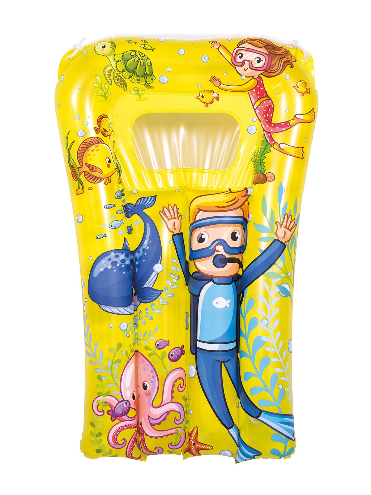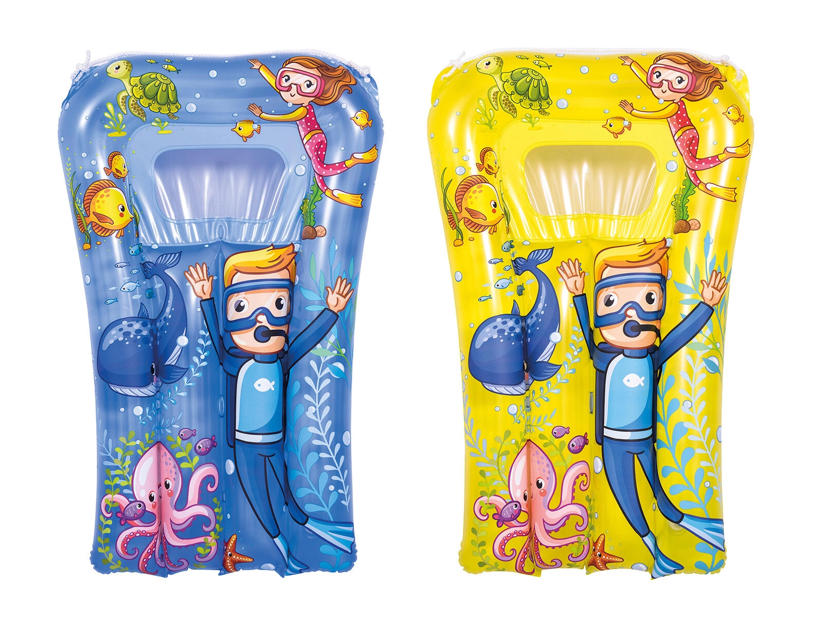 Uživajte v poletju z edinim tem kompaktnim napihljivim ležiščem za otroke, velikosti 67 × 43 cm. Zahvaljujoč vgrajenemu prozornemu okencu in udobnemu naslonjalu za glavo ponuja zabavno opazovanje pod vodno gladino, varno plovnost in lahko upravljanje v vodi. Na voljo v mešanici barv – rumena in modra z veselimi morskimi motivi.