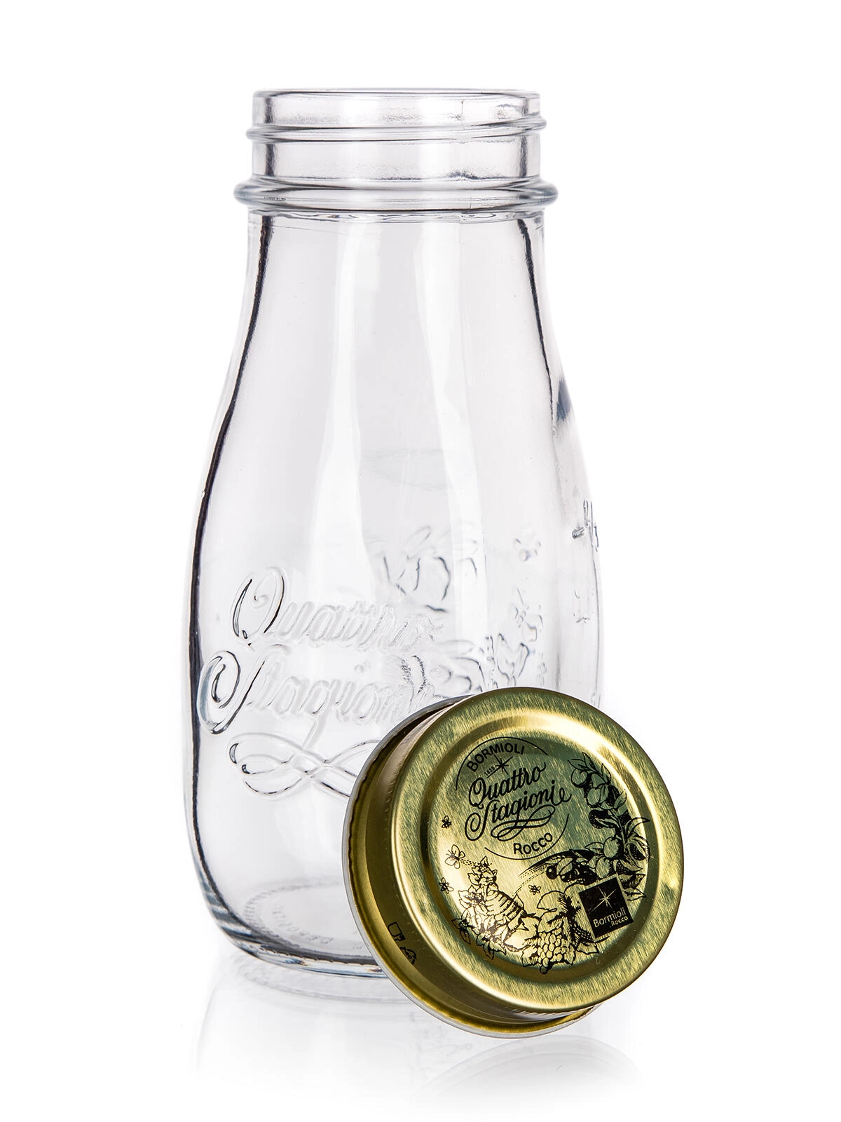 Ta univerzalna steklena steklenica Quattro Stagioni s prostornino 400 ml se odlično poda v vsak dom. Zahvaljujoč trdnemu kovinskemu pokrovčku zanesljivo zapre vsebino in pomaga ohranjati njeno svežino. Primerna je ne le za domače vlaganje omak, sokov ali sirupov, temveč tudi kot elegantna steklenica za vsakodnevno pitje.