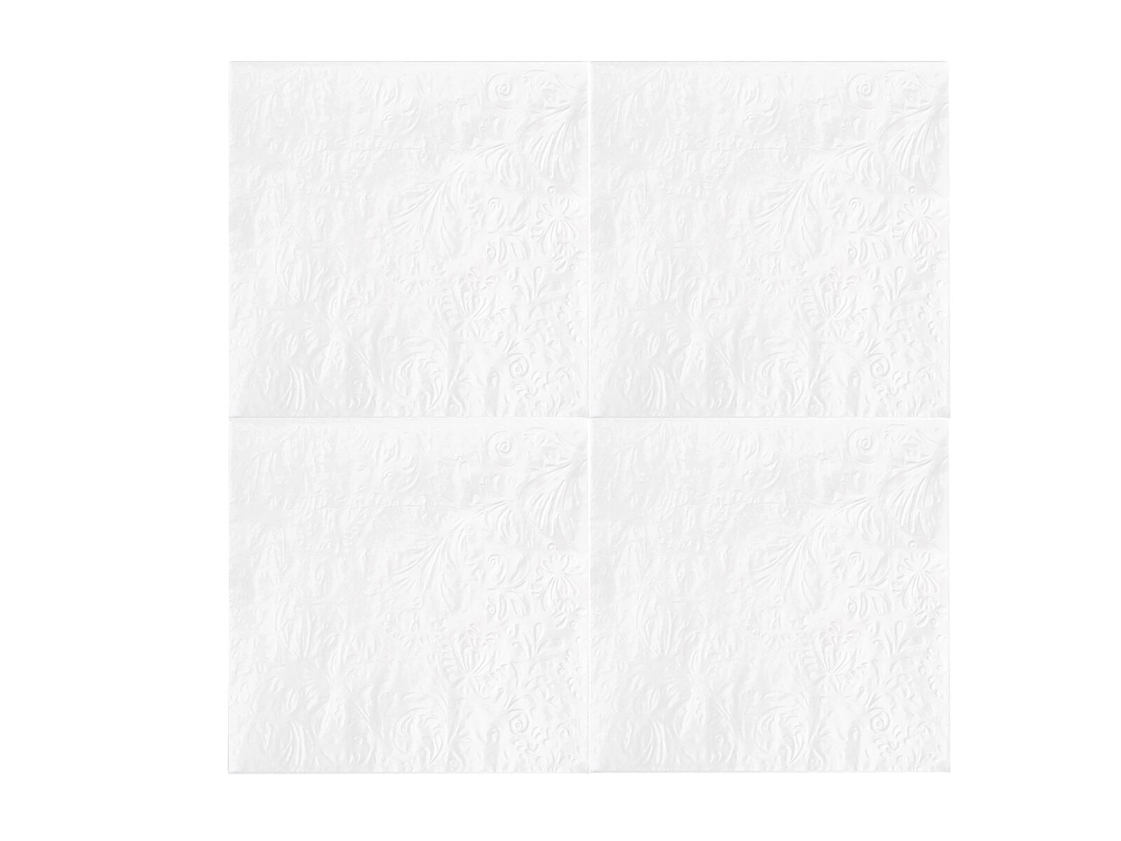 V praktičnem pakiranju 20 kosov imate vedno pri roki zadostno zalogo za serviranje prigrizkov, malic ali sladic. Nevtralna bela barva z reliefom se zlahka kombinira s katerim koli jedilnim servisom in dekoracijo, zato se odlično poda k vsakemu stilu pogrinjka.