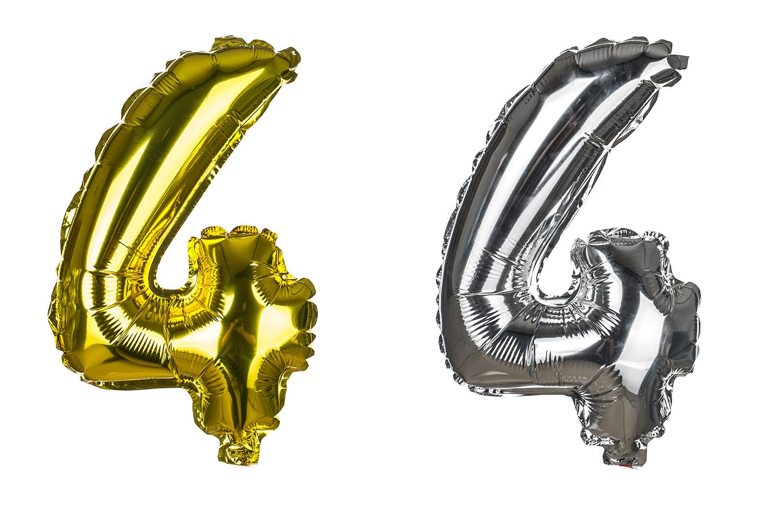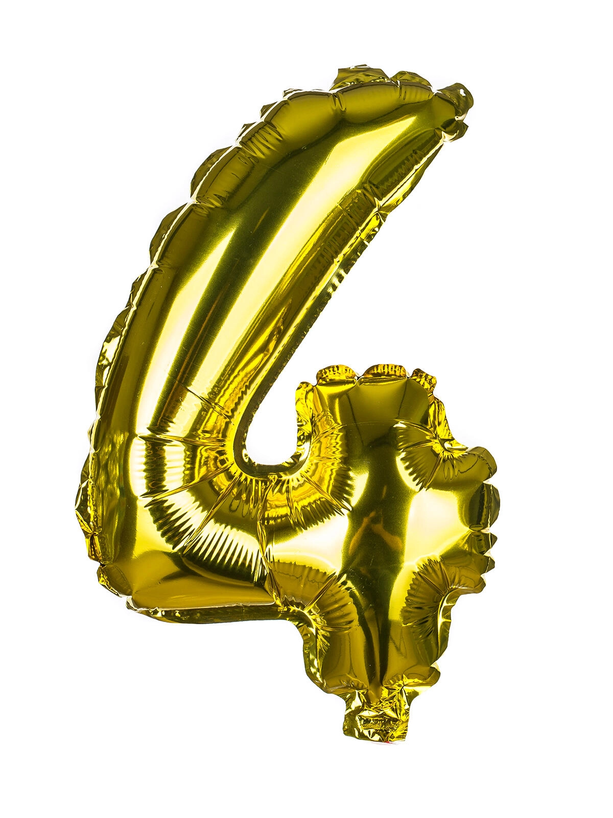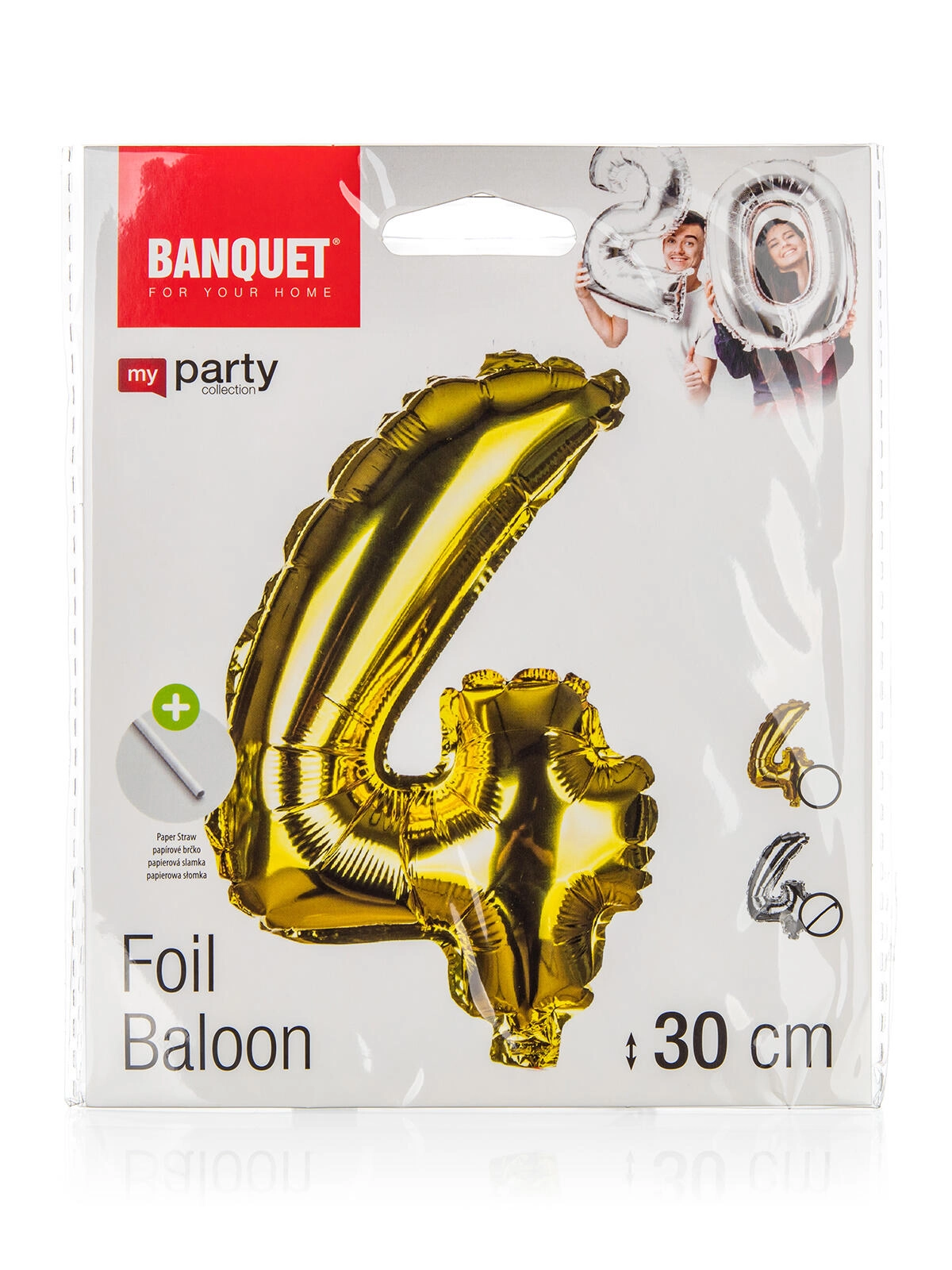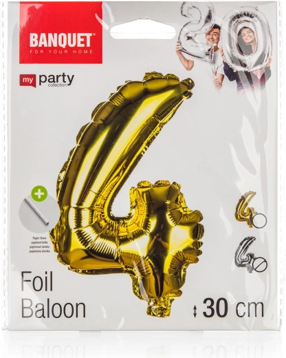 Stilski folijski balon v obliki številke 4, visok približno 30 cm, v elegantni zlati ali srebrni barvi. Enostavno napihovanje s priloženo papirnato slamico in preprosto obešanje na vrvico. Idealno za rojstne dneve, obletnice, vrtne zabave in tematska praznovanja.