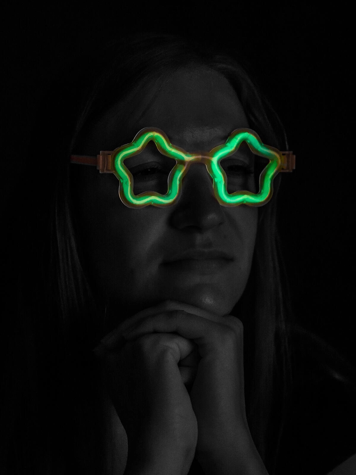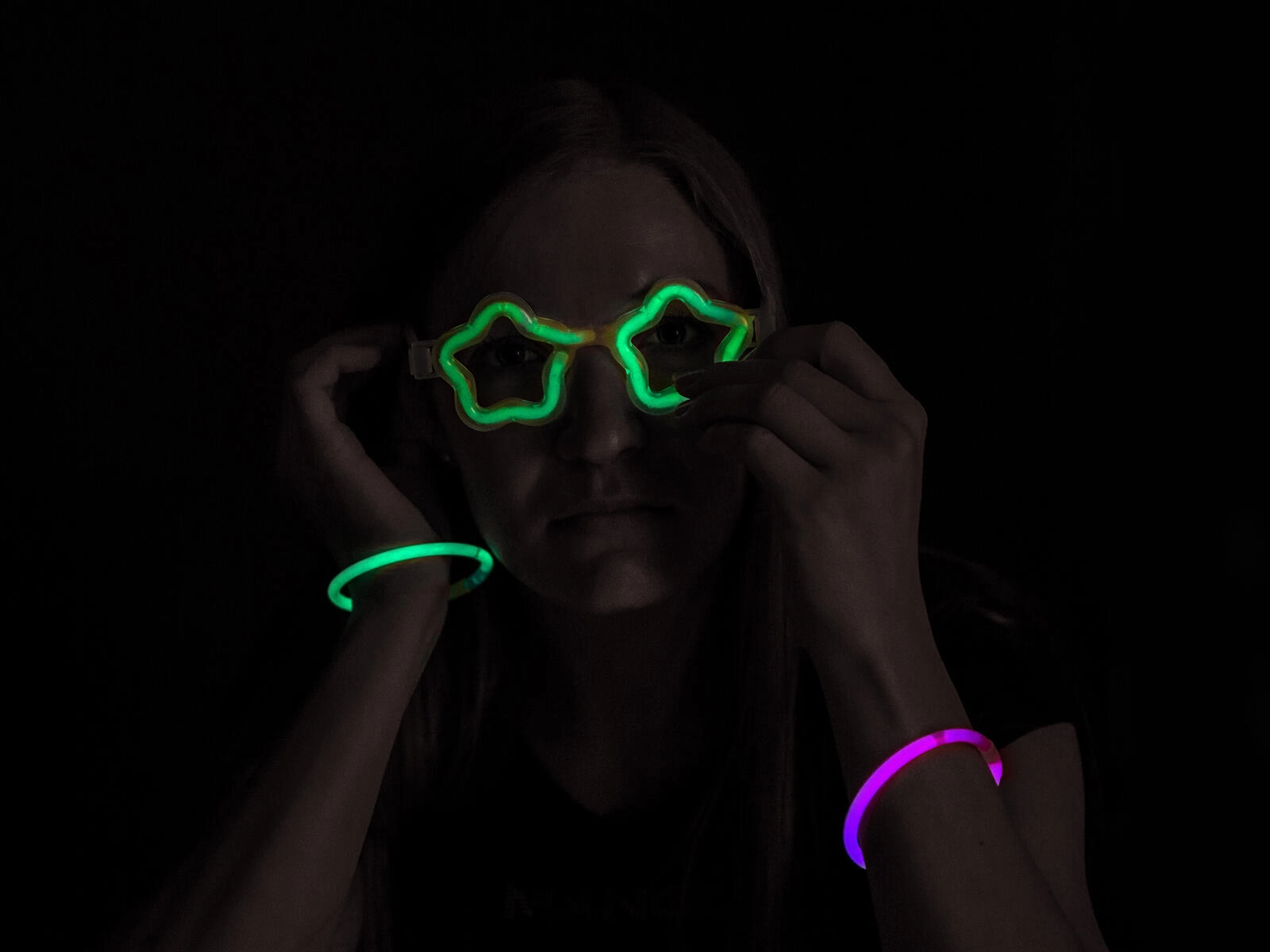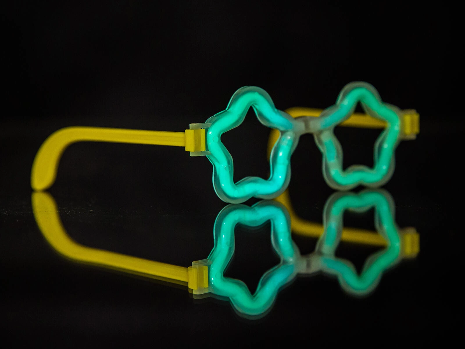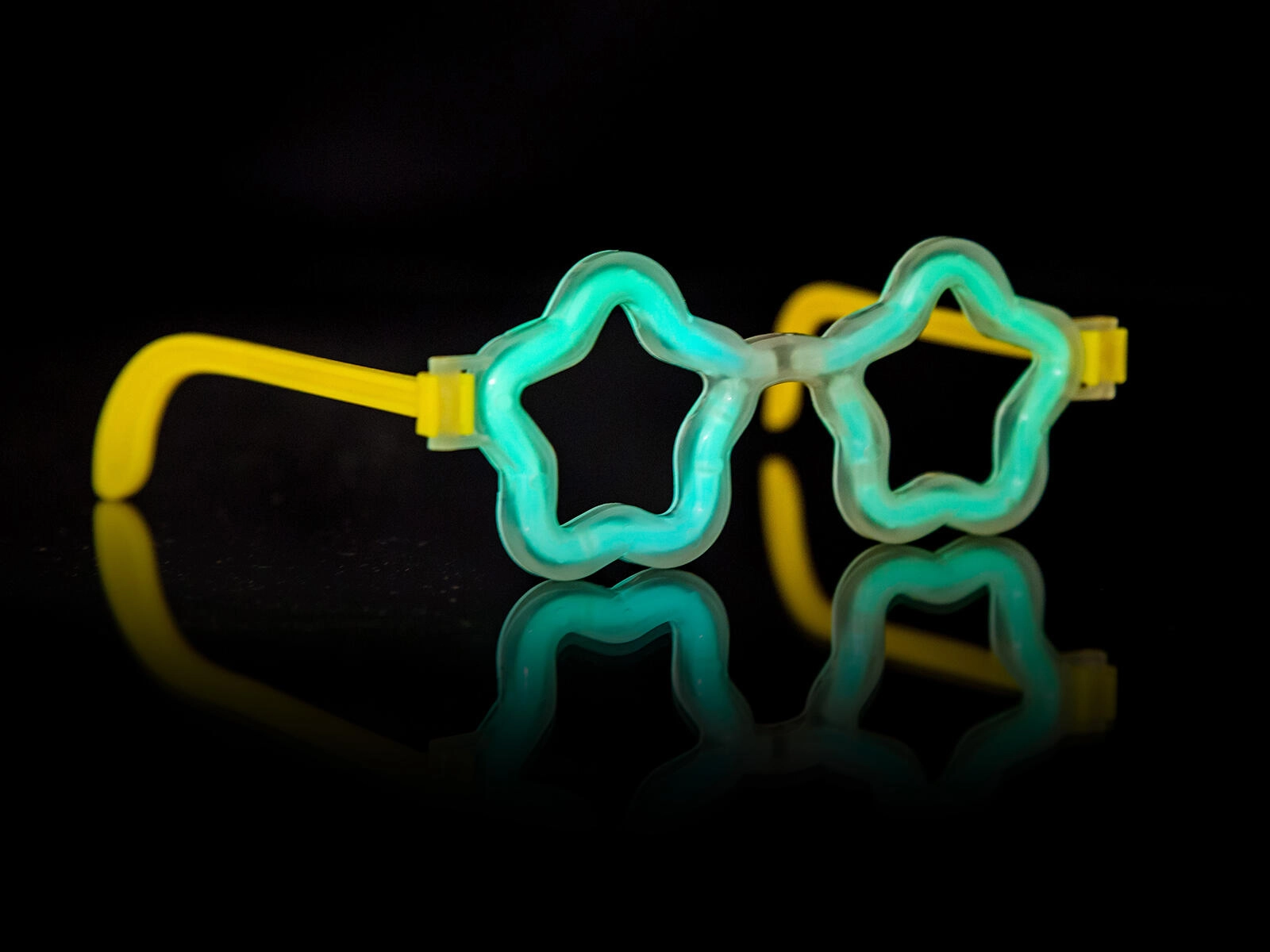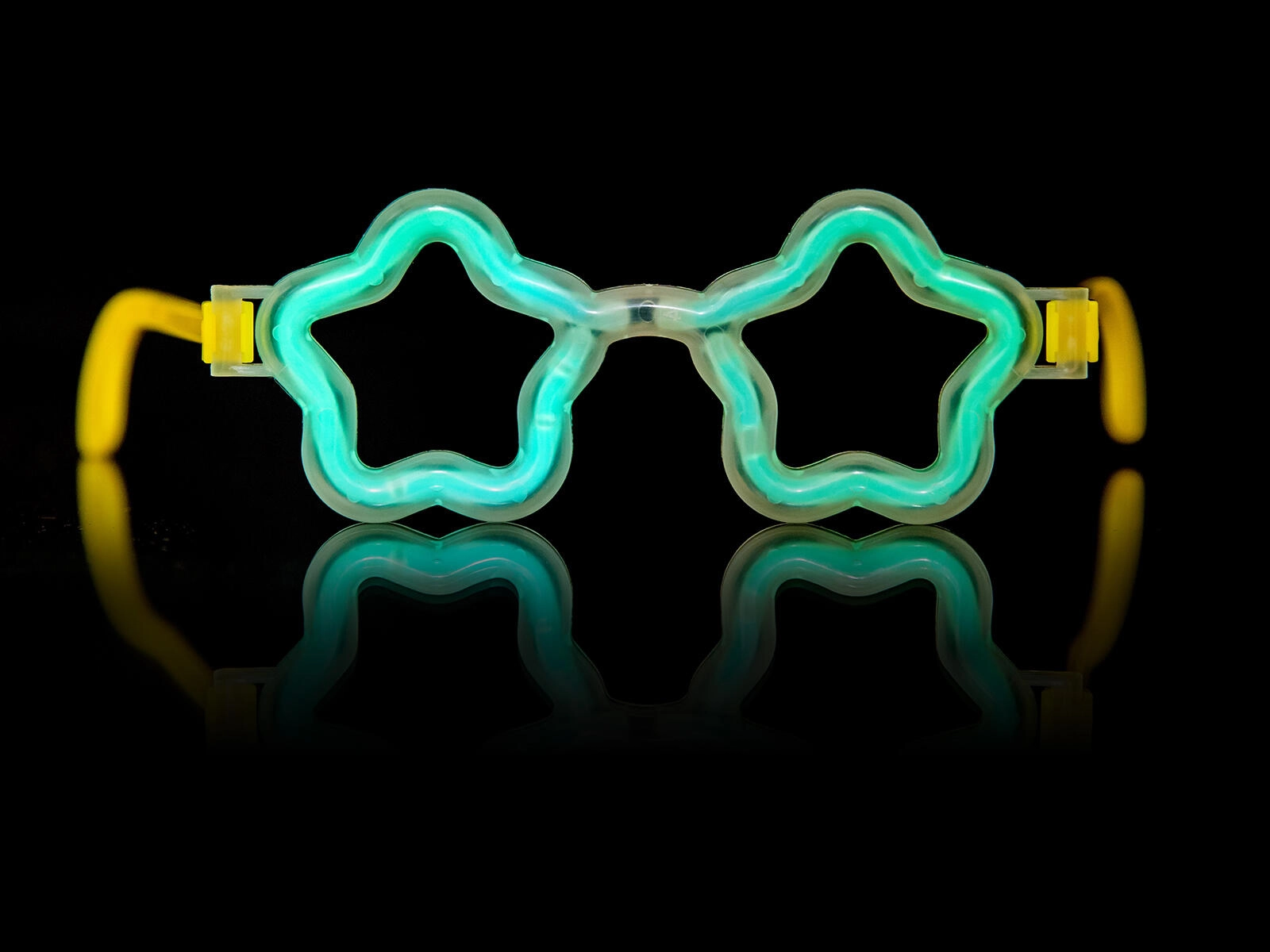 Edinstvena zvezdasta oblika očal z jasno svetlečimi cevčicami pritegne pozornost in razsvetli fotografije ter plesišče.