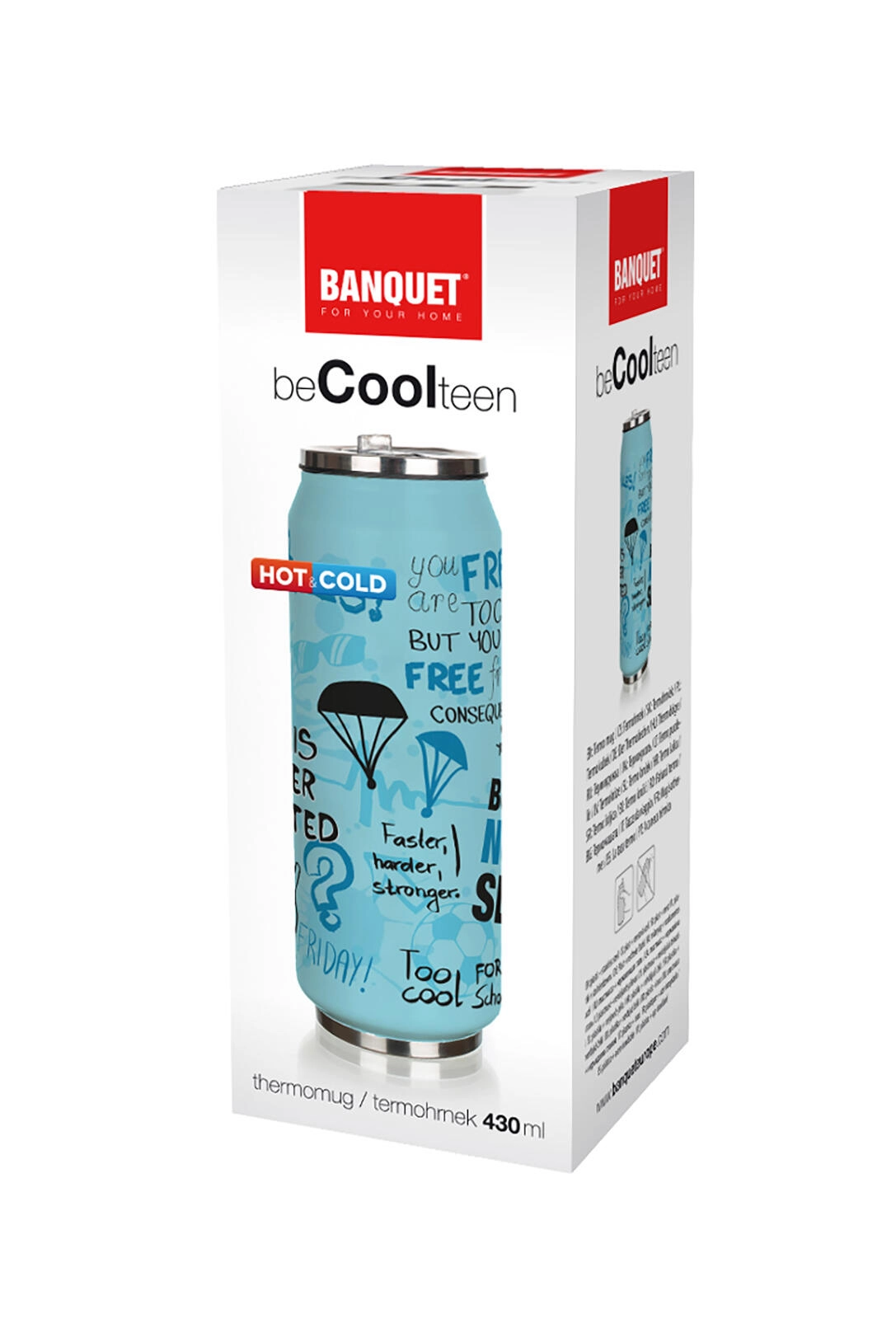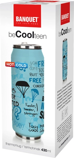 Stilska termovka v obliki pločevinke s prostornino 430 ml ohranja vašo pijačo dlje pri idealni temperaturi zahvaljujoč dvojni steni iz nerjavečega jekla. Udobno ustnik s slamico preprečuje polivanje, silikonsko tesnilo pa zanesljivo preprečuje uhajanje. Kompaktne mere so idealne za na pot, v šolo in v službo.