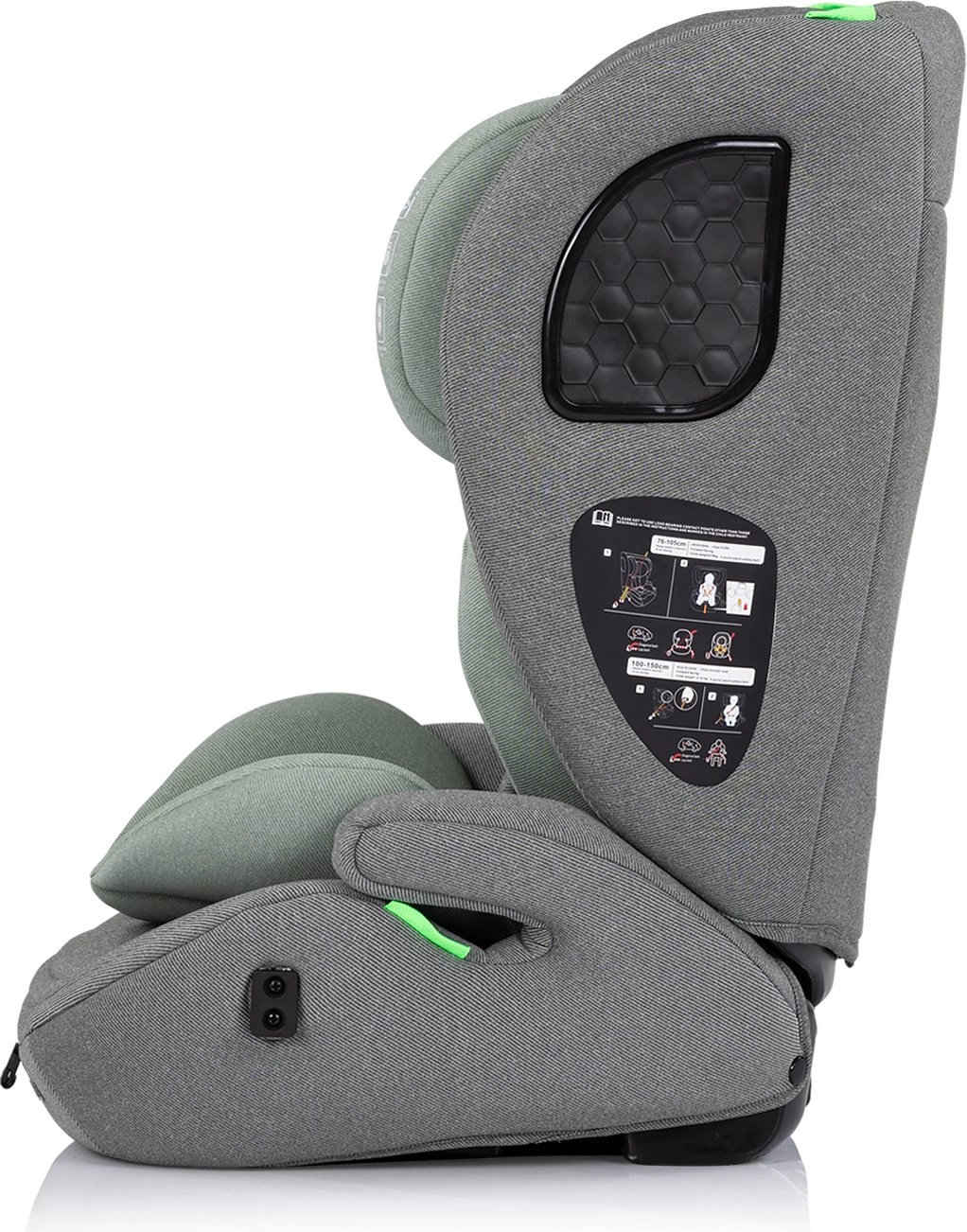 Sedež izpolnjuje najnovejši standard i-Size, vključno s testi čelnega, zadnjega in bočnega trka. Izbira po višini zagotavlja pravilno namestitev otroka.