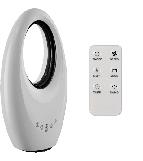 Sodoben brezkrilni stoječi ventilator zagotavlja enakomeren in tih pretok zraka brez neprijetnih sunkov. Zahvaljujoč daljinskemu upravljanju, digitalnemu krmiljenju in časovniku do 12 ur je idealen za dnevno sobo, pisarno in spalnico. Varna zasnova brez kril, 3 hitrosti in široka oscilacija za učinkovito ohlajanje celotnega prostora.