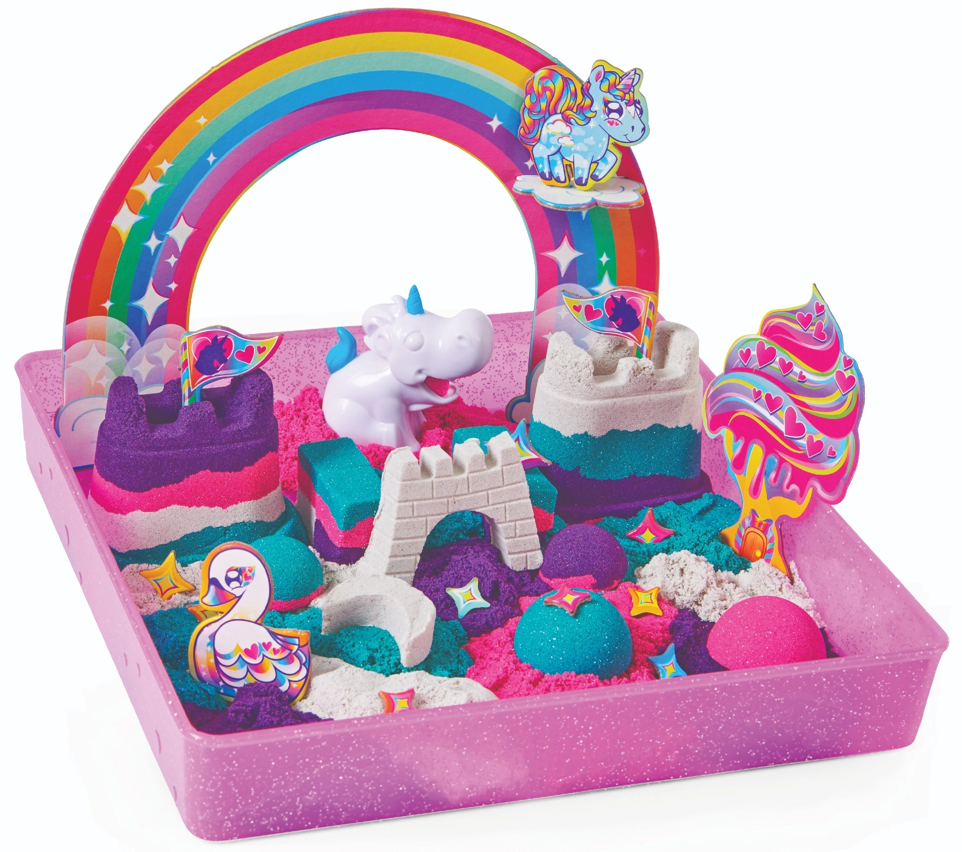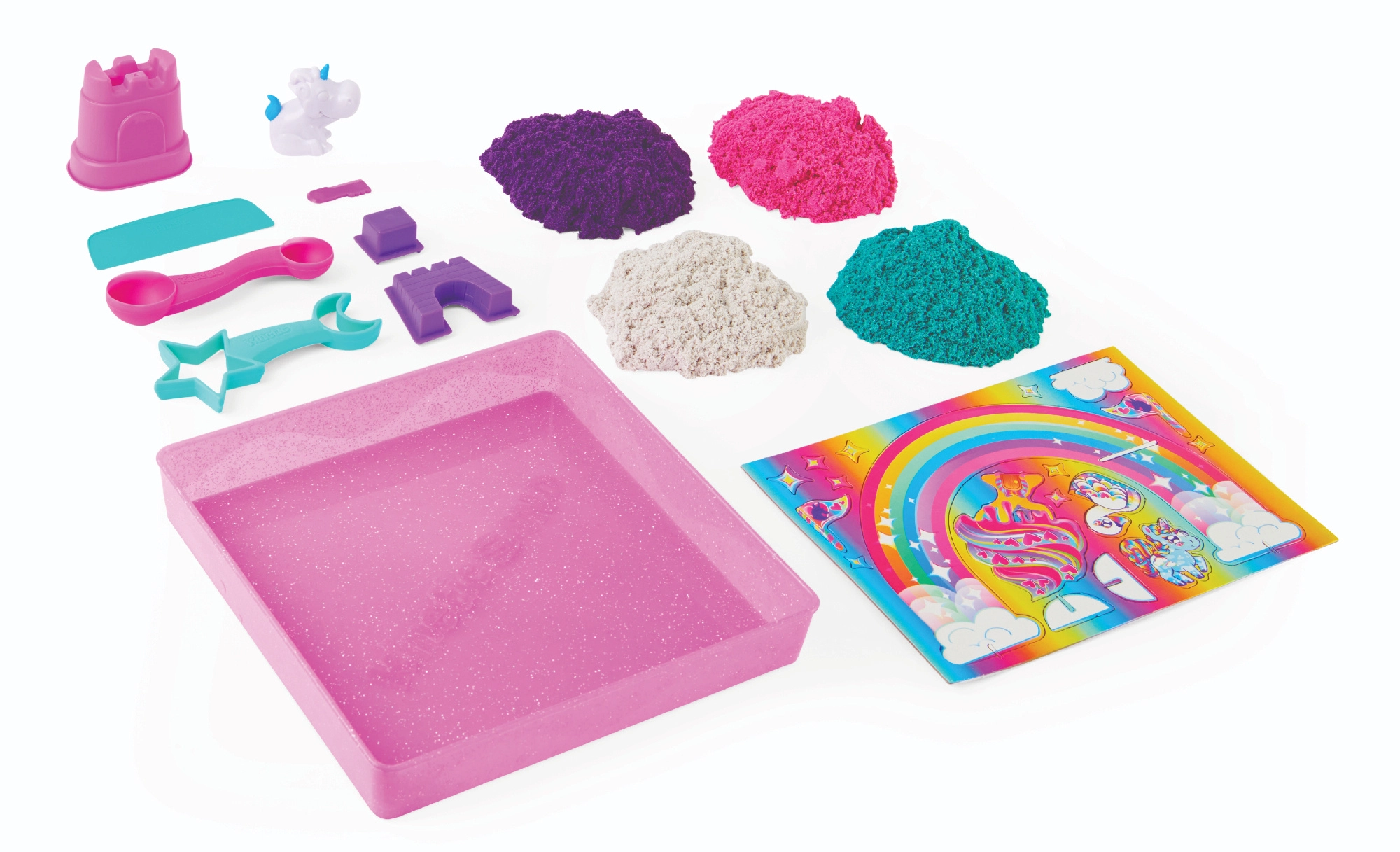 Vstopite v pravljični svet enorogov in zgradite svoje kraljestvo iz kinetičnega peska. V pakiranju najdete približno 0,9 kg peska v štirih barvah – vijolični, rožnati, turkizni in beli – z subtilnim leskom, ki vsakemu ustvarjenemu delu doda čaroben videz.