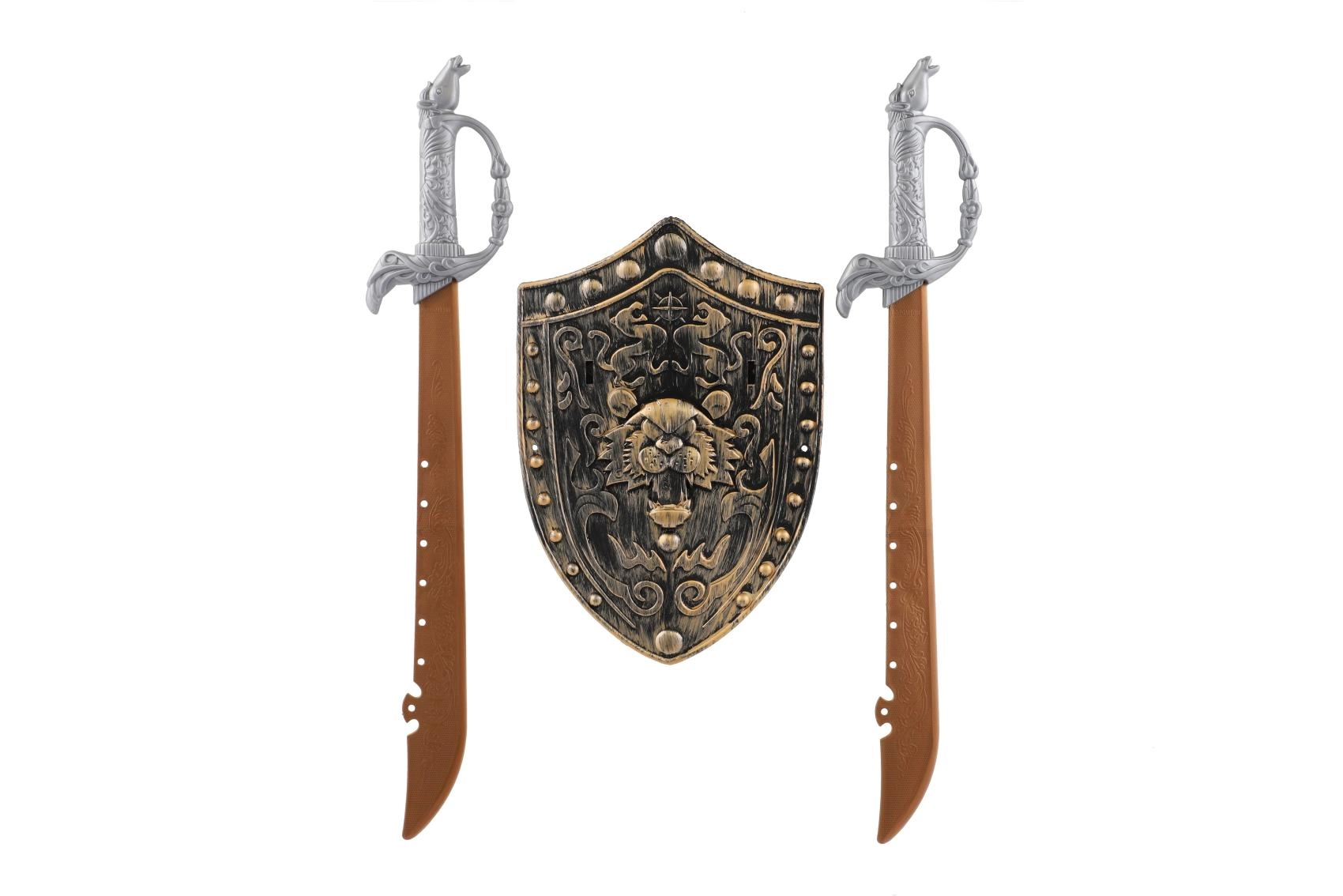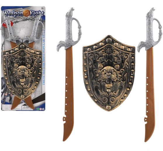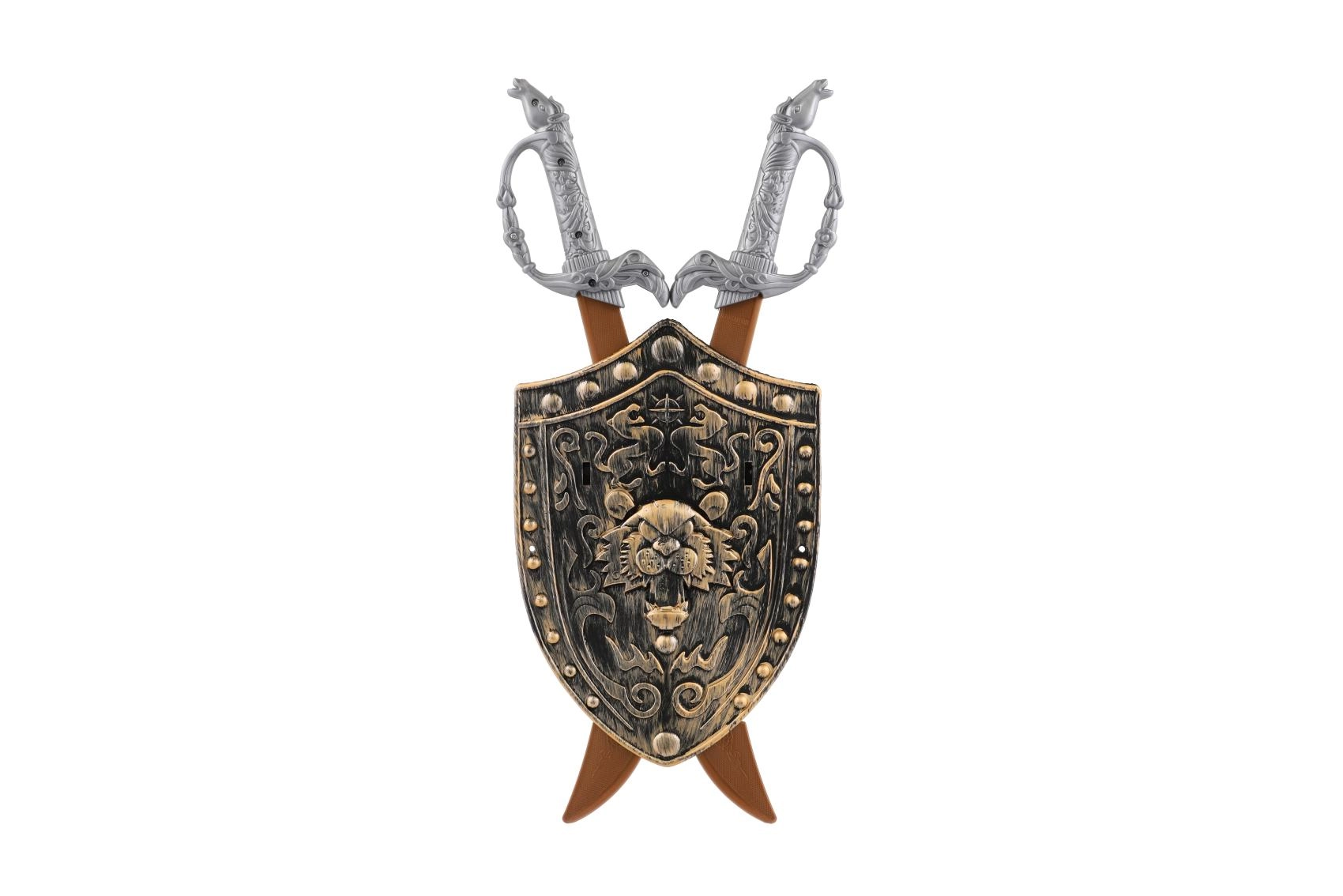 Otrokom omogočite akcijske viteške bitke in domišljijske zgodbe s kompletom, ki združuje varne plastične meče in okrašen ščit z emblemom leva. Odličen za domačo igro, maškarade in otroške predstave.