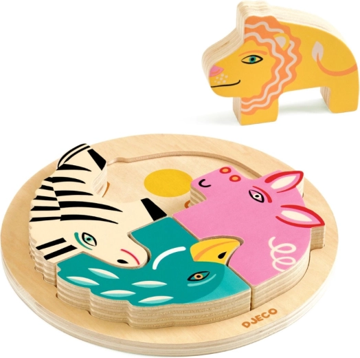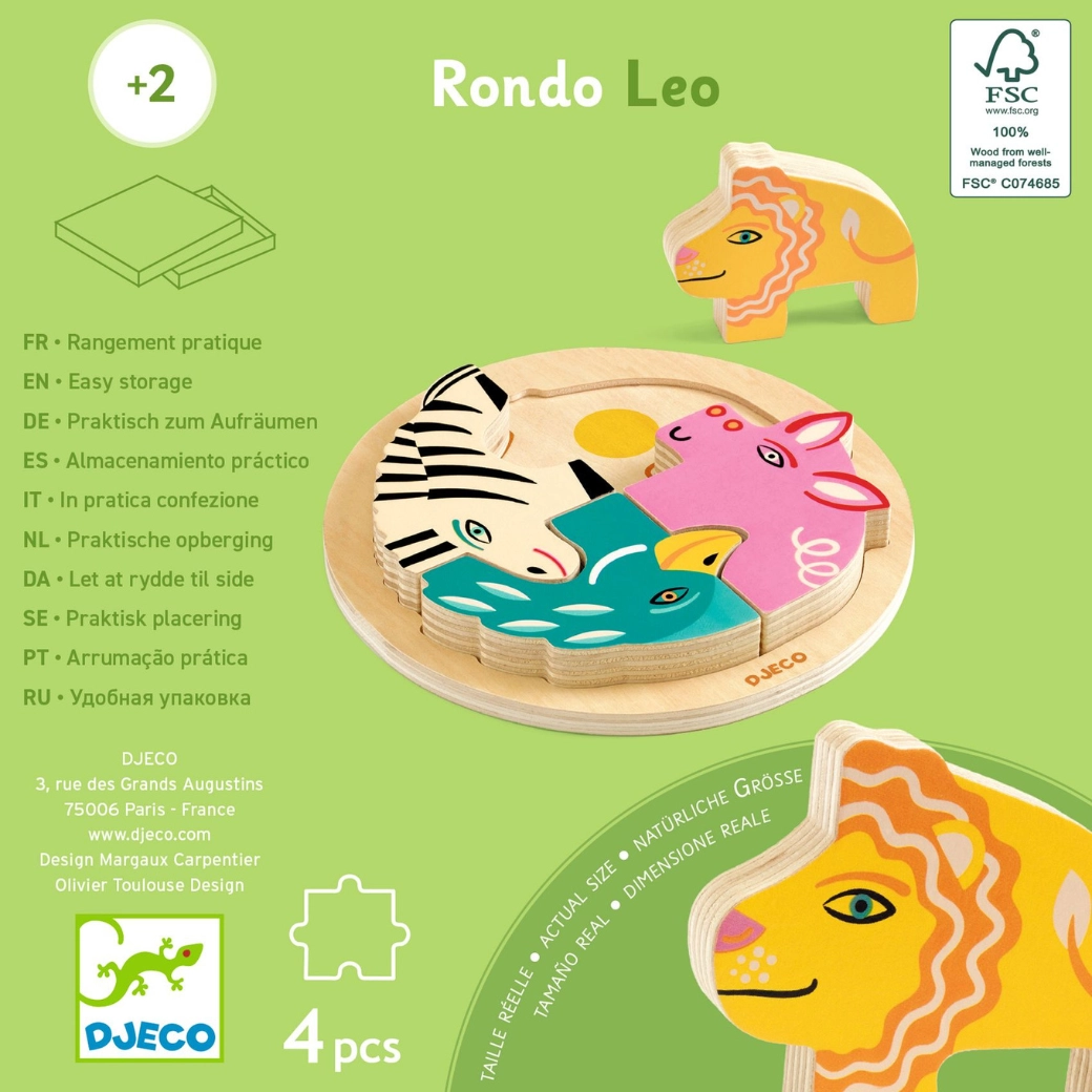 DJECO Rondo Leo so kakovostne lesene puzzle, zasnovane za otroke od 2. leta dalje. Okrogla osnova z vodilnimi utori in jasno označenimi mesti otrokom pomaga intuitivno sestaviti štiri izrazite živalske koščke. Zahvaljujoč debelim, enostavno oprijemljivim komponentam se otroci skozi igro učijo in razvijajo pomembne veščine.