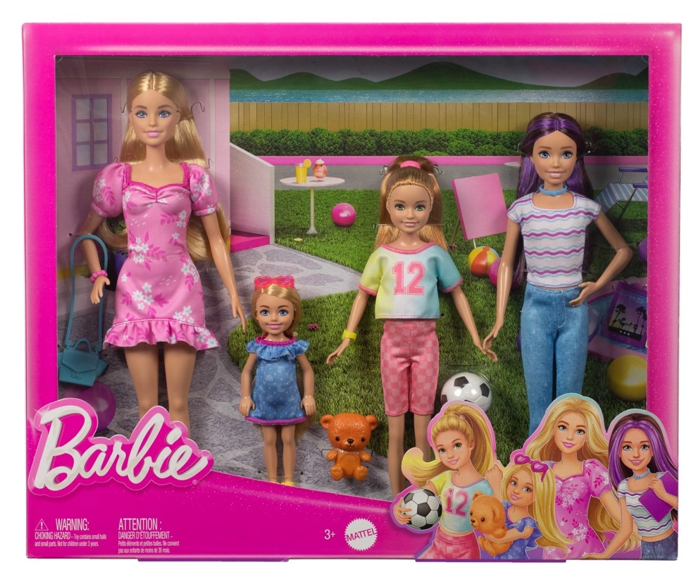 Ta pisani družinski set prinaša štiri različne like s svojim edinstvenim videzom in zanimanji: elegantno Barbie v rožnati obleki, tehnično radovedno Skipper s tablico, športno Stacie z nogometno žogo in simpatično Chelsea s plišastim medvedkom. Vsaka punčka ima snemljiva oblačila in detajle, ki spodbujajo realistično igro.