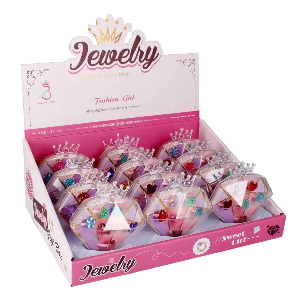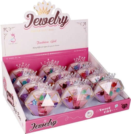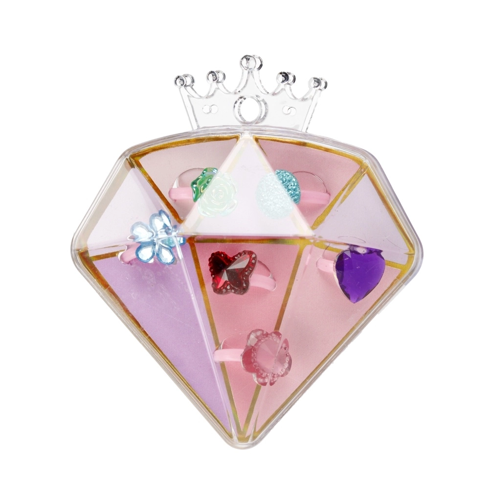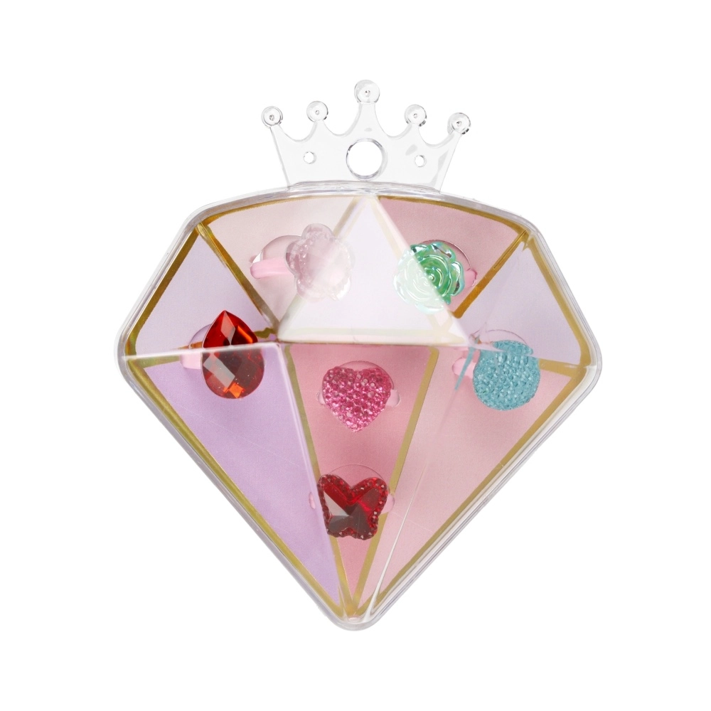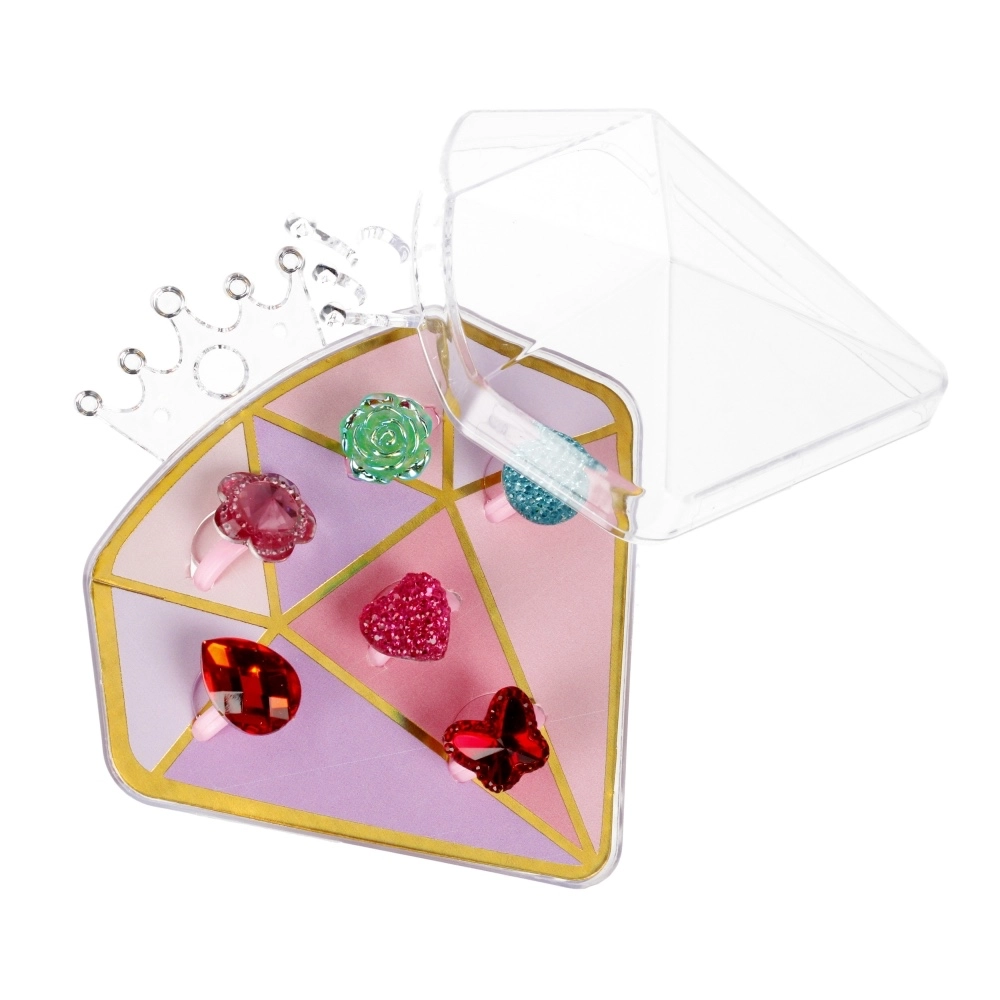 Ljubek komplet vsebuje 6 otroških prstančkov v mešanici barv in motivov, shranjenih v prozorni diamantni škatlici z rožnatim dnom. Lahkotni plastični prstančki bodo razveselili male modne navdušenke, škatlica pa jih ohrani lepo urejene in zaščitene. Brez baterij, primerno za otroke od 3 let.