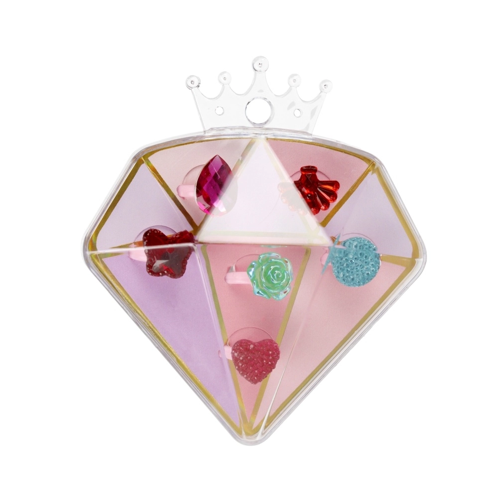 Podarite otrokom veselje preoblačenja in domišljije s stilnim kompletom prstančkov v elegantni škatlici v obliki diamanta. Vsak prstanček ima drugačen motiv (srčki, rožice, kamnčki) in veselo barvo, zato si otroci zlahka izberejo pravega za vsak dan.