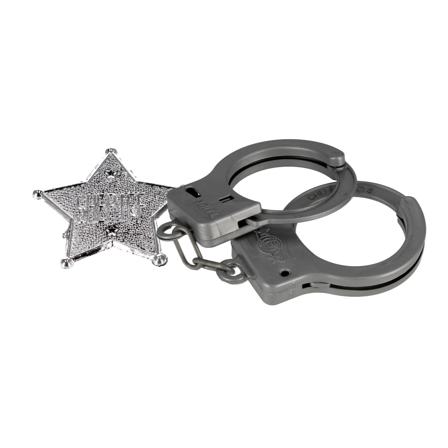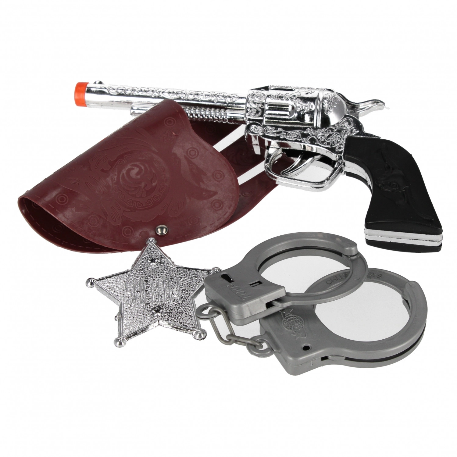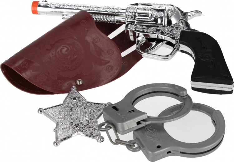 - Celovit set: igrača-orožje, šerifova značka in lisice