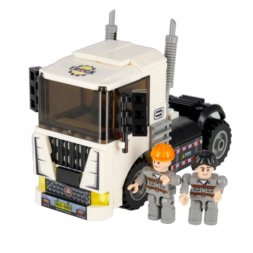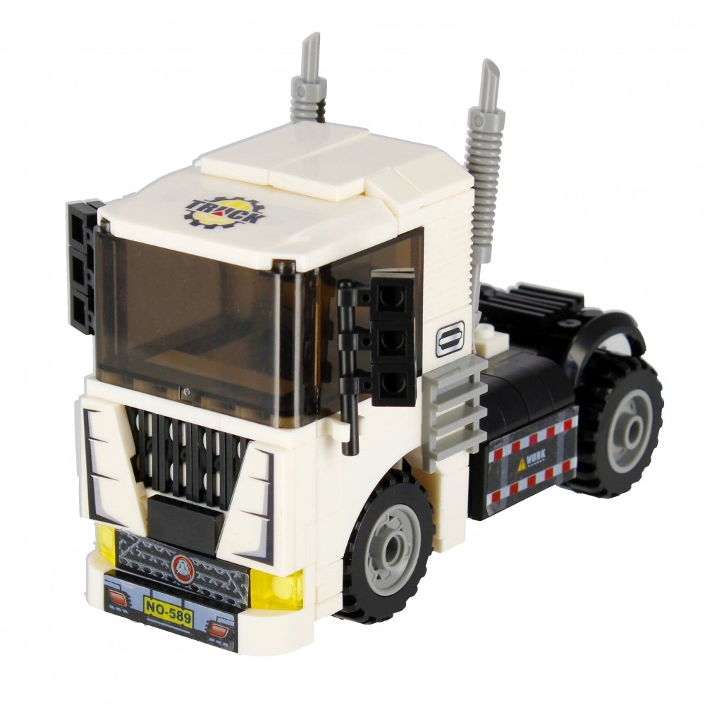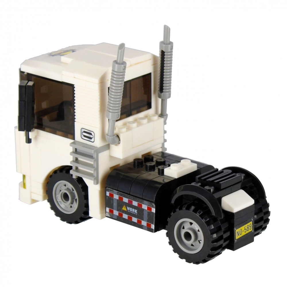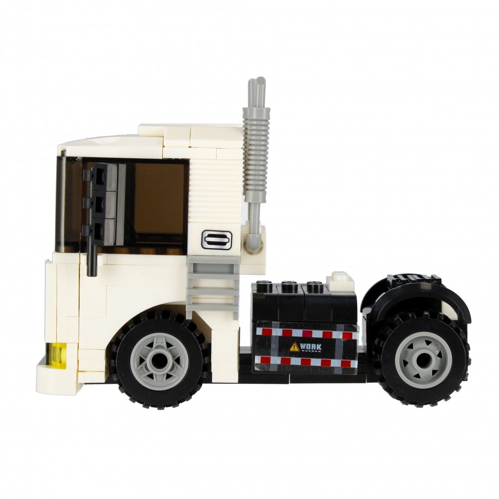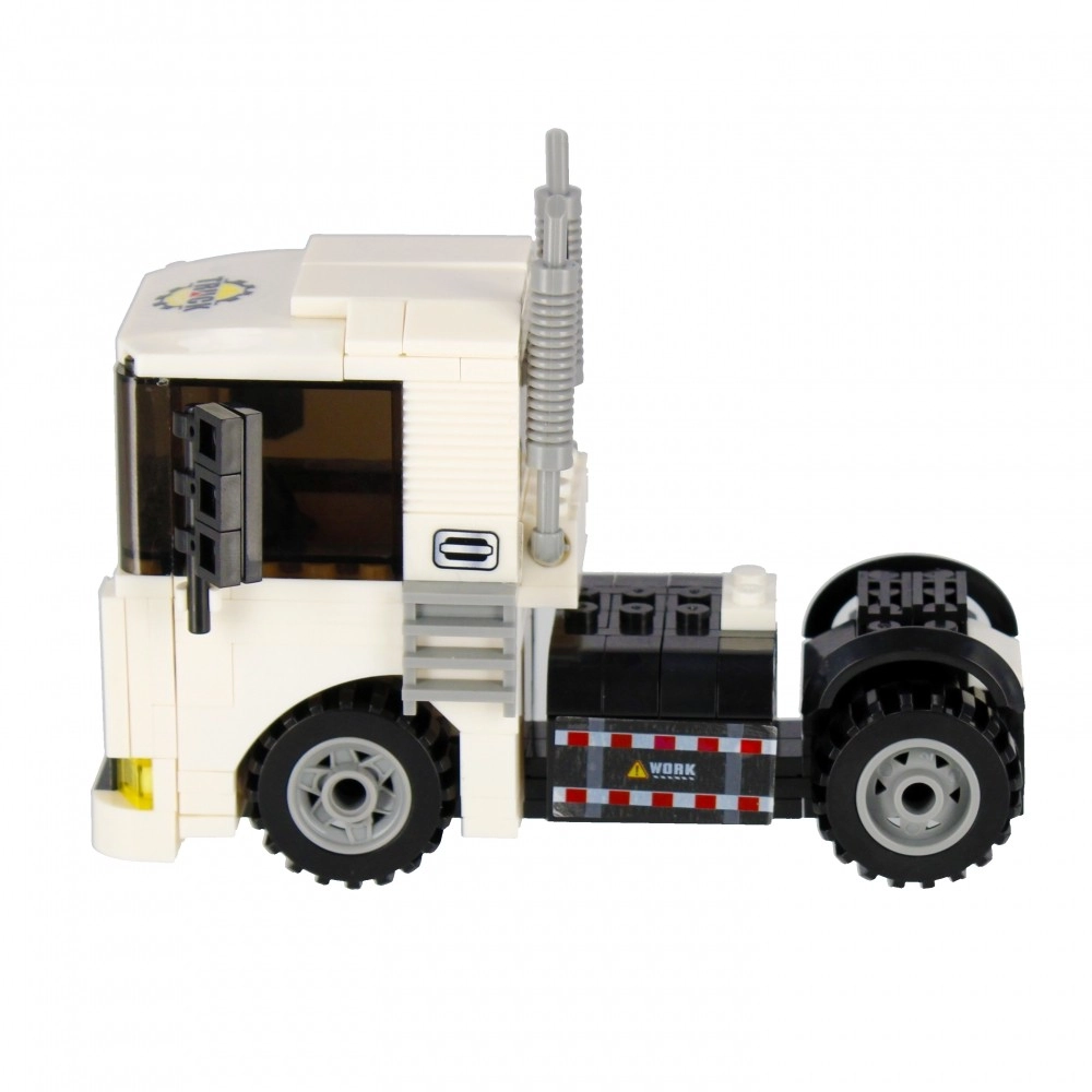 Sestavite bel vlačilec z delujočimi kolesi, izpuhi in izrazito kabino. Idealno za prevoz in gradbene scenarije v vašem mestu.
