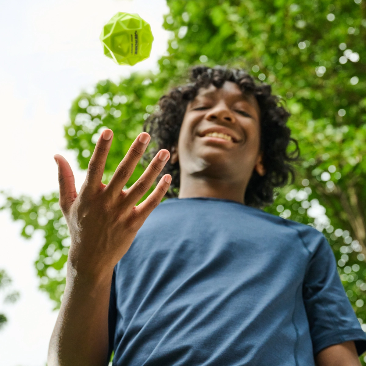 Vzdržljiv, prožen material z odličnim oprijemom olajša metanje, lovljenje in dribling po tleh. Lahko tekmujete, komu bo odskočila višje, vadite trike ali izboljšujete reflekse pri solo igri. Raznobarvna izvedba naredi žogico dobro vidno v parku in na igrišču.