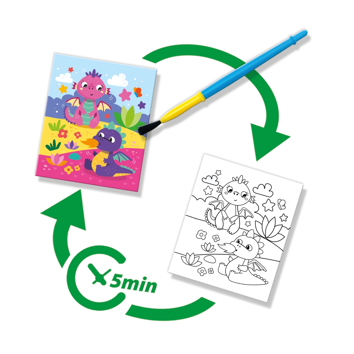 Spremenite ustvarjalni čas otrok v čisto veselje. Set »Slikanje z vodo – Fantasy« omogoča otrokom od 3 let, da slikajo samo z vodo – brez barv, brez madežev in brez pospravljanja. Ko se navlažijo, se slike razcvetijo v barvah, po sušenju pa spet izginejo, zato lahko otroci uživajo v slikanju znova in znova.