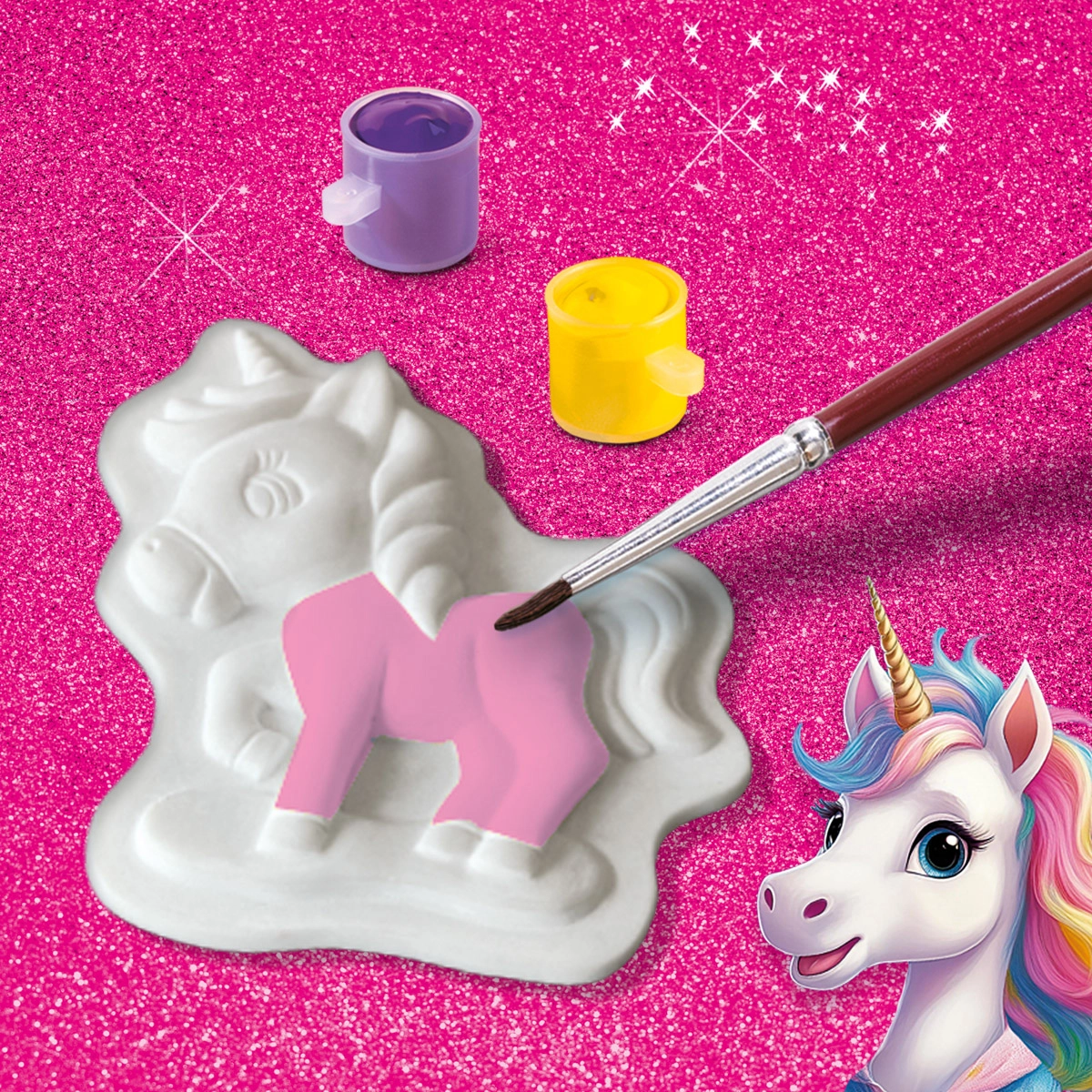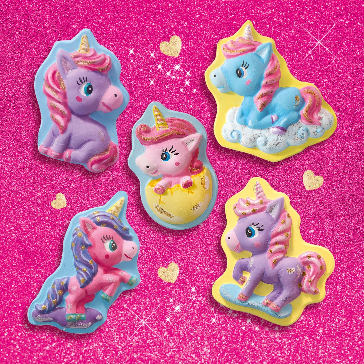 Prebudite domišljijo in ustvarite svojo kolekcijo čarobnih samorogovih mladičev. Zahvaljujoč praktičnemu kalupu in finemu mavcu je ulivanje primerno tudi za začetnike. Figurice nato okrasite s pestremi barvami ali jih s kombiniranjem spremenite v nežne pastelne tone. Za končni bleščeč učinek poskrbi zlato in srebrno bleščilno lepilo.