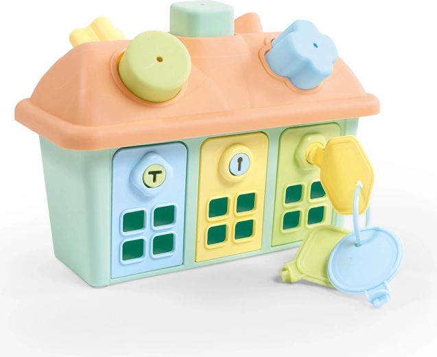 Odkrijte pametno izobraževalno igračo, ki združuje vstavljanje oblik s treningom koordinacije oko–roka in reševanjem preprostih nalog. Na strehi je pripravljenih 5 odprtin za različne oblike, na sprednji strani pa troje vratc, ki jih je mogoče odkleniti s pravilnim ključem. Pastelne barve so otrokom privlačne in pomagajo pri razlikovanju barv.