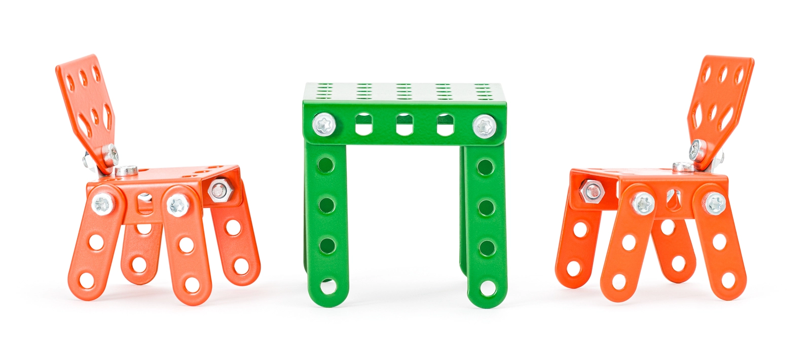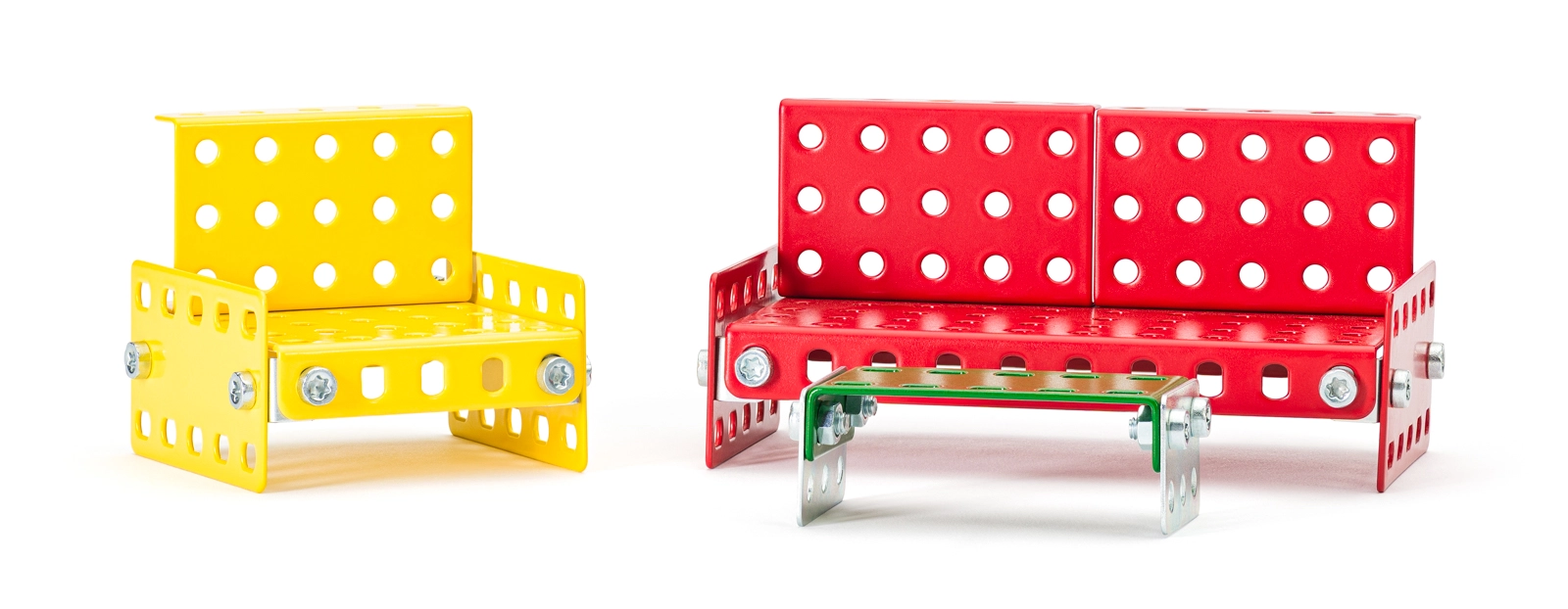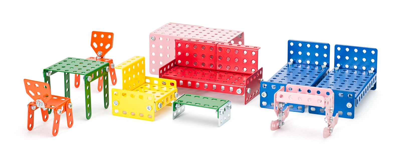 Stabilni modeli stolov, miz, postelj in kavča iz perforiranih kovinskih delov prenesejo intenzivno igro in jih je mogoče večkrat znova sestaviti.