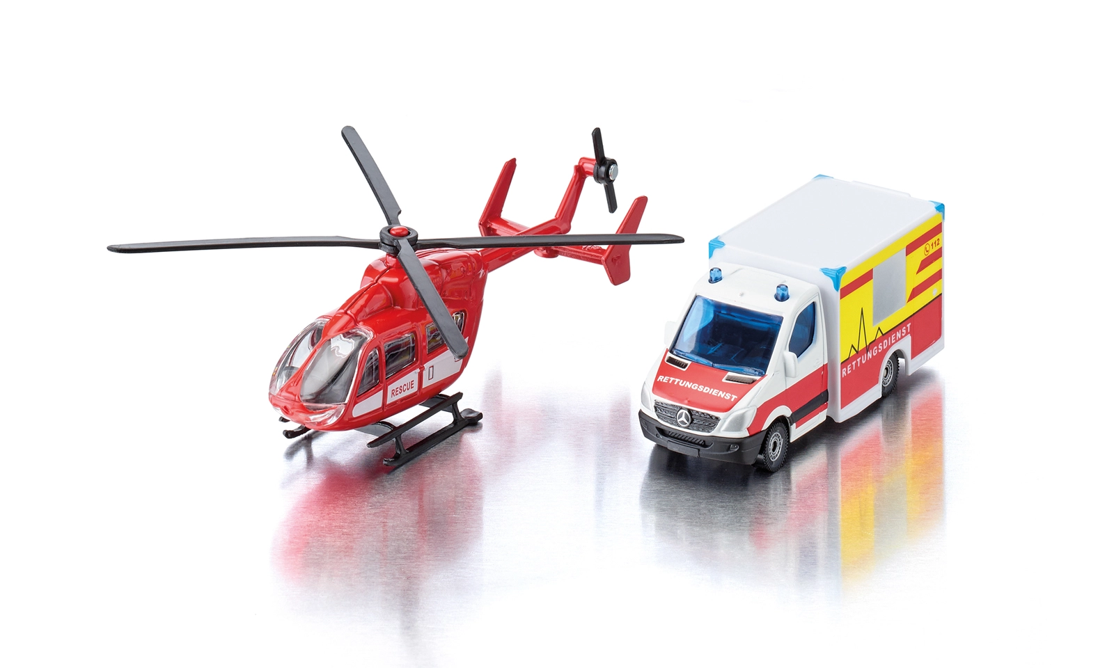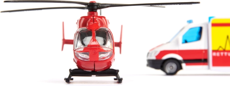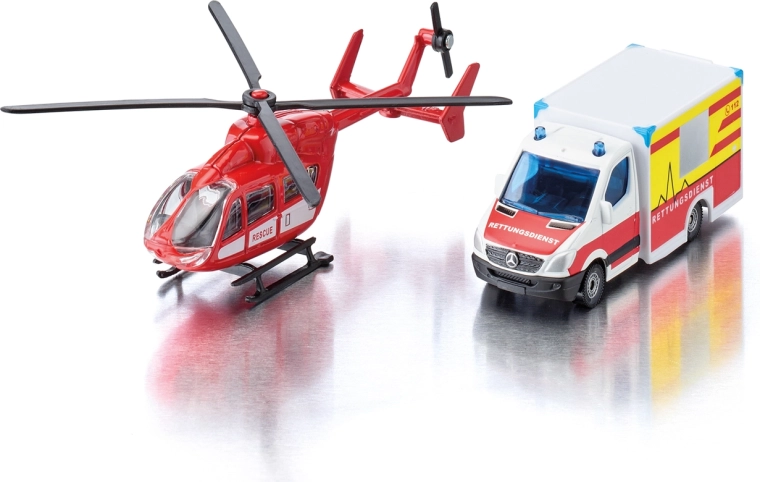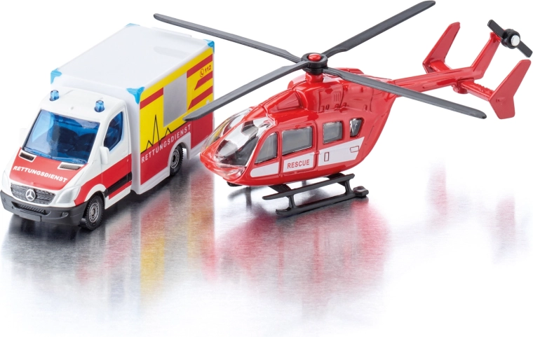 Ta podrobni set SIKU združuje dve ključni enoti reševalnega sistema – kopensko in zračno. Reševalno vozilo Mercedes‑Benz navduši z avtentično barvno shemo, realističnimi napisi in signalizacijo. Helikopter EUROCOPTER EC145 ponuja vrtljive rotorje, dodelano kabino posadke in reševalne oznake za ustvarjanje realističnih igralnih prizorov.