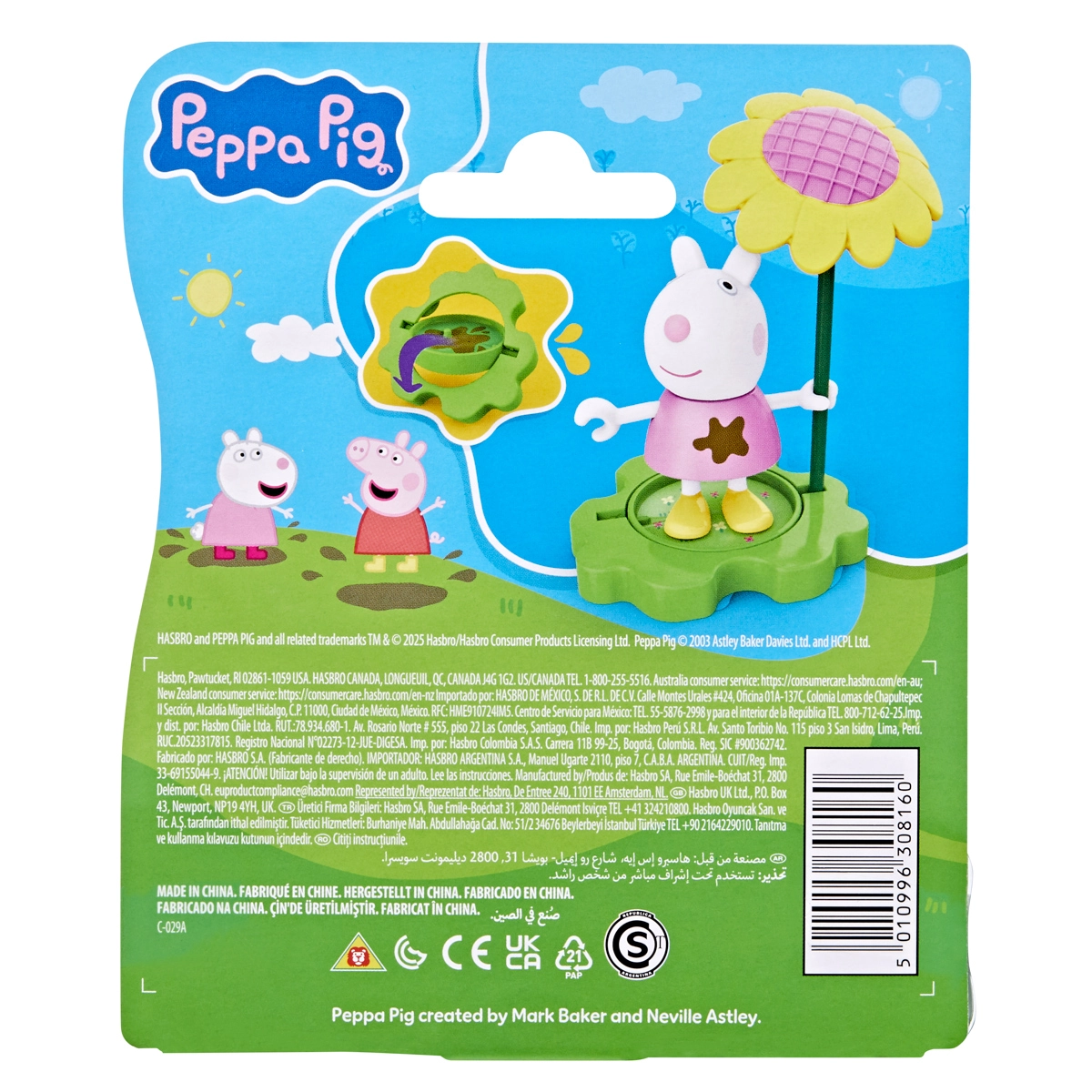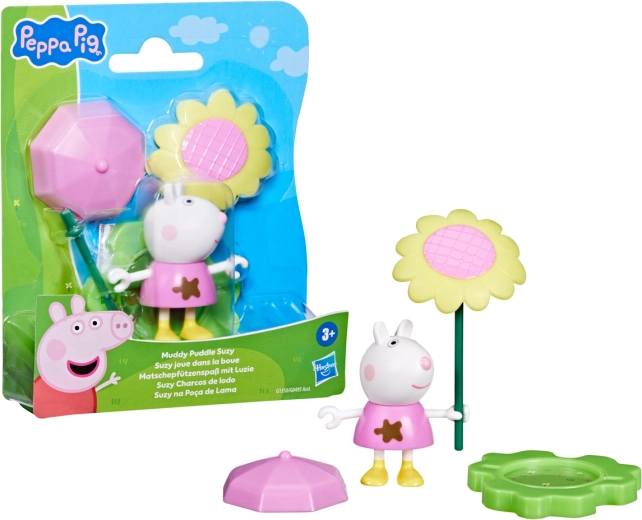 S tem kompletom se otroci preselijo naravnost v svet PEPPA PIG. Lik Suzy je pripravljen na zabavo v lužah in blatu, senčnik ter dežnik pa igri dodajata čar spremenljivega vremena. Stojalo poskrbi, da figurica stabilno stoji pri vsaki pustolovščini.