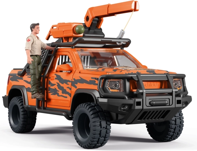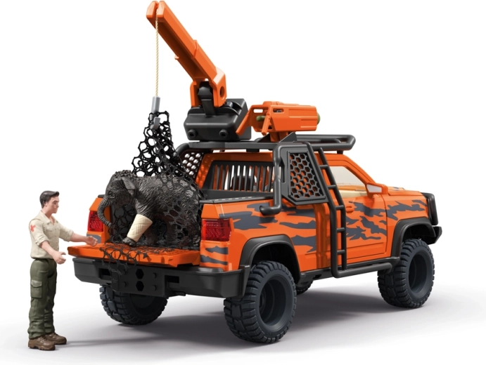 To pustolovsko reševalno vozilo obvlada tudi zahteven teren – parkirajte pri živali, izstrelišče mrežo iz topa na strehi in z delujočim vitlom varno prestavite malega slona na tovorni prostor. Odpirajoča se vrata, pokrov motorja in prtljažna vrata poskrbijo za pristnost igre, medtem ko čuvaj Tom z premičnimi rokami in nogami izvede oskrbo s priloženim povojem.