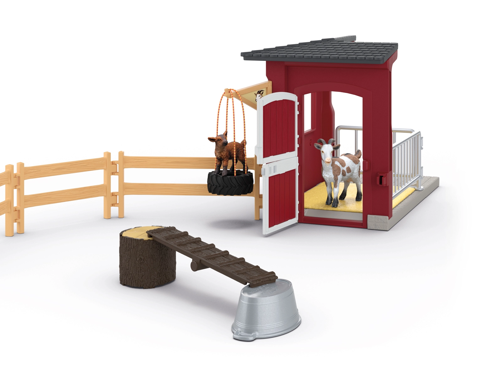 V čudovitem rdečem hlevčku se koza s kozličkom počutita kot doma. Kozliček se lahko igra na gugalnici iz pnevmatike ali pleza po rampi, medtem ko mamica uživa v sveži zelenjavi. Zvečer ju čaka prijeten kotiček s slamnato podlago. Realistične podrobnosti in vrhunska izdelava figurin SCHLEICH navdušita vsakega malega rejca.
