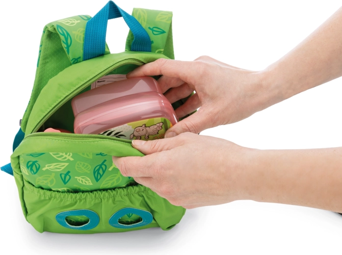 Glavni žep z zadrgo sprejme malico, steklenico in manjše igrače. Sprednji žep z elastiko pliškota varno drži na mestu.