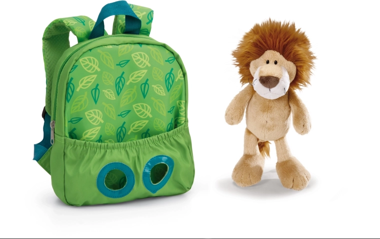 Iščete praktičen in prikupno igriv nahrbtnik za male pustolovce? Zeleni nahrbtnik NICI z listnim vzorcem združuje funkcionalnost in zabavo – otroci bodo s seboj vzeli svoje drobnarije ter hkrati priljubljenega plišastega leva (25 cm), ki je pritrjen v elastičnem sprednjem žepu in jih lahko “spremlja” na vsakem koraku.