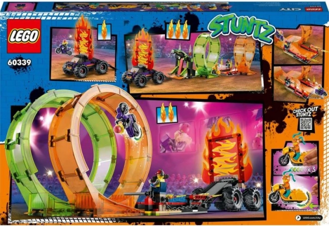 Komplet LEGO City Stuntz Kaskaderska dvojna zanka prinaša otrokom od 7 let neskončne možnosti igre. Postavitev arene z ognjeno zanko, zanko s kačjo čeljustjo in impresivnim ognjenim zidom dvigne kaskaderske trike na novo raven. Motorja z vztrajnikom zlahka dosežeta hitrost in se podata v akcijo, medtem ko monster truck z rampo zaključi šov z veličastnim skokom.