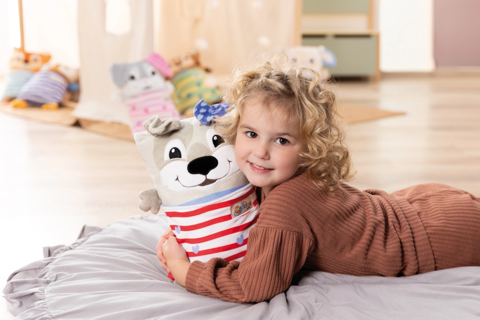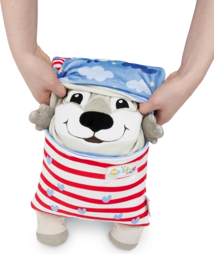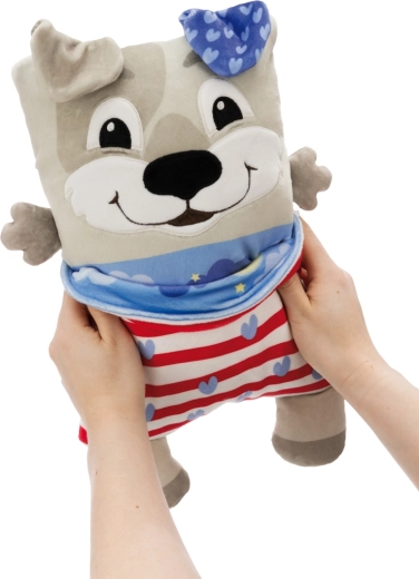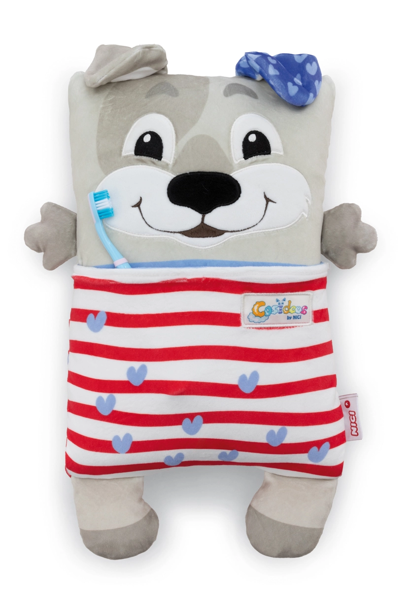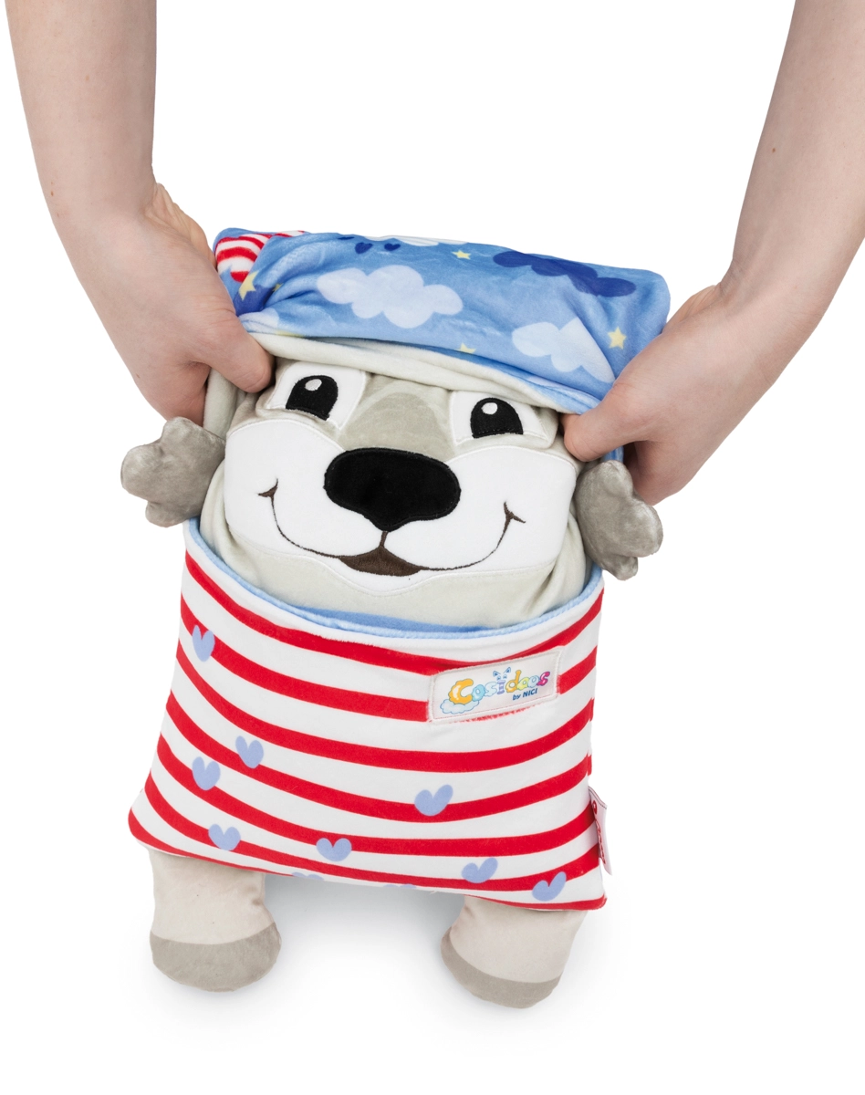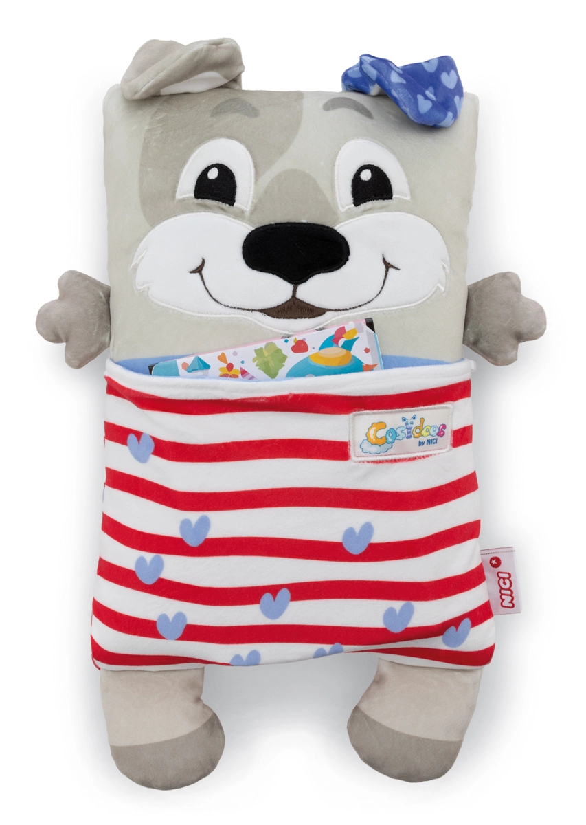 Odkrijte čar brezskrbnega prehoda med igro in počitkom. NICI Cosidoos je mehak kužek s sivim telesom in modrim uhljem, ki se z enim obratom spremeni iz igrivega prijatelja v mehko blazinico z nočnim motivom. Otroci bodo vzljubili njegov ljubek izraz, nežne materiale in pomirjujoče barve z oblački, zvezdami in mesecem.