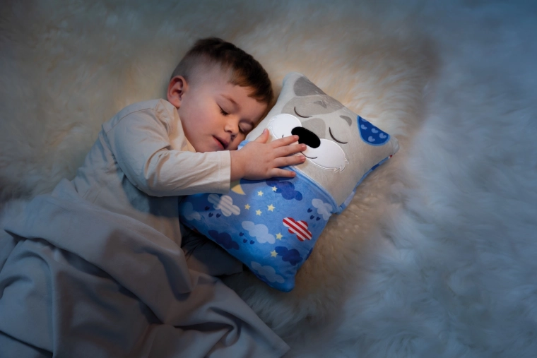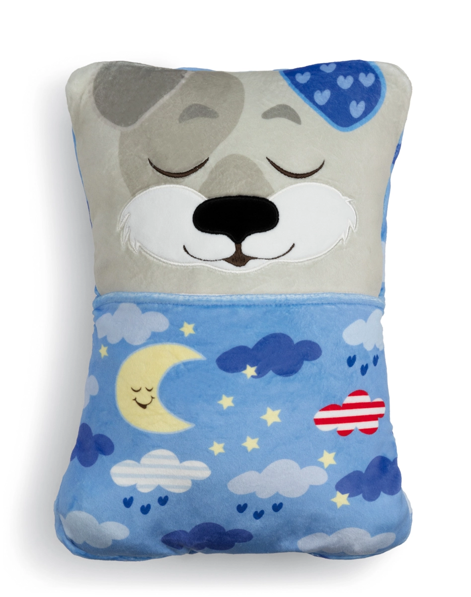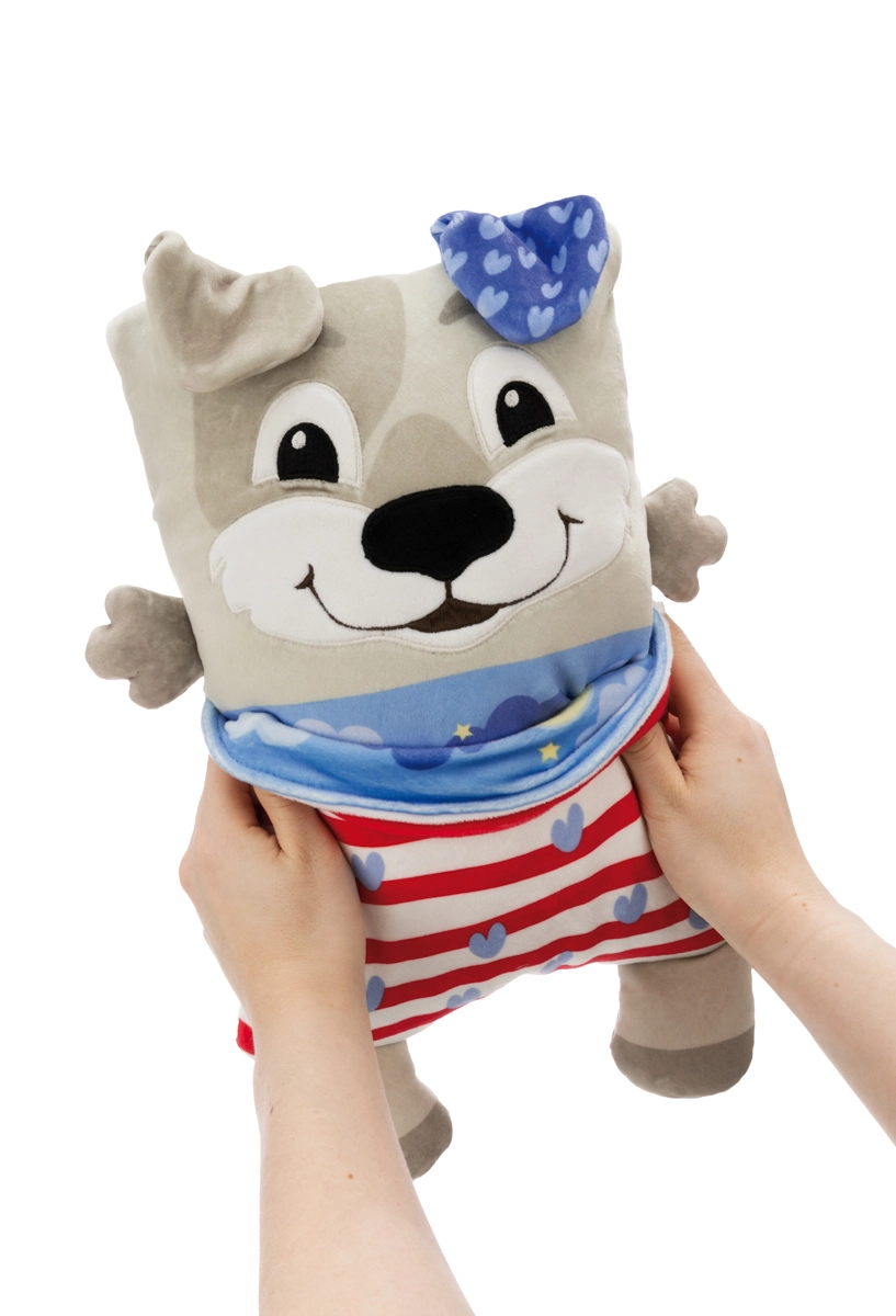 Z enostavnim obračanjem spremenite veselega kužka v pomirjujočo nočno blazinico z oblački, zvezdami in mesecem. Popoln večerni ritual za lažje uspavanje.