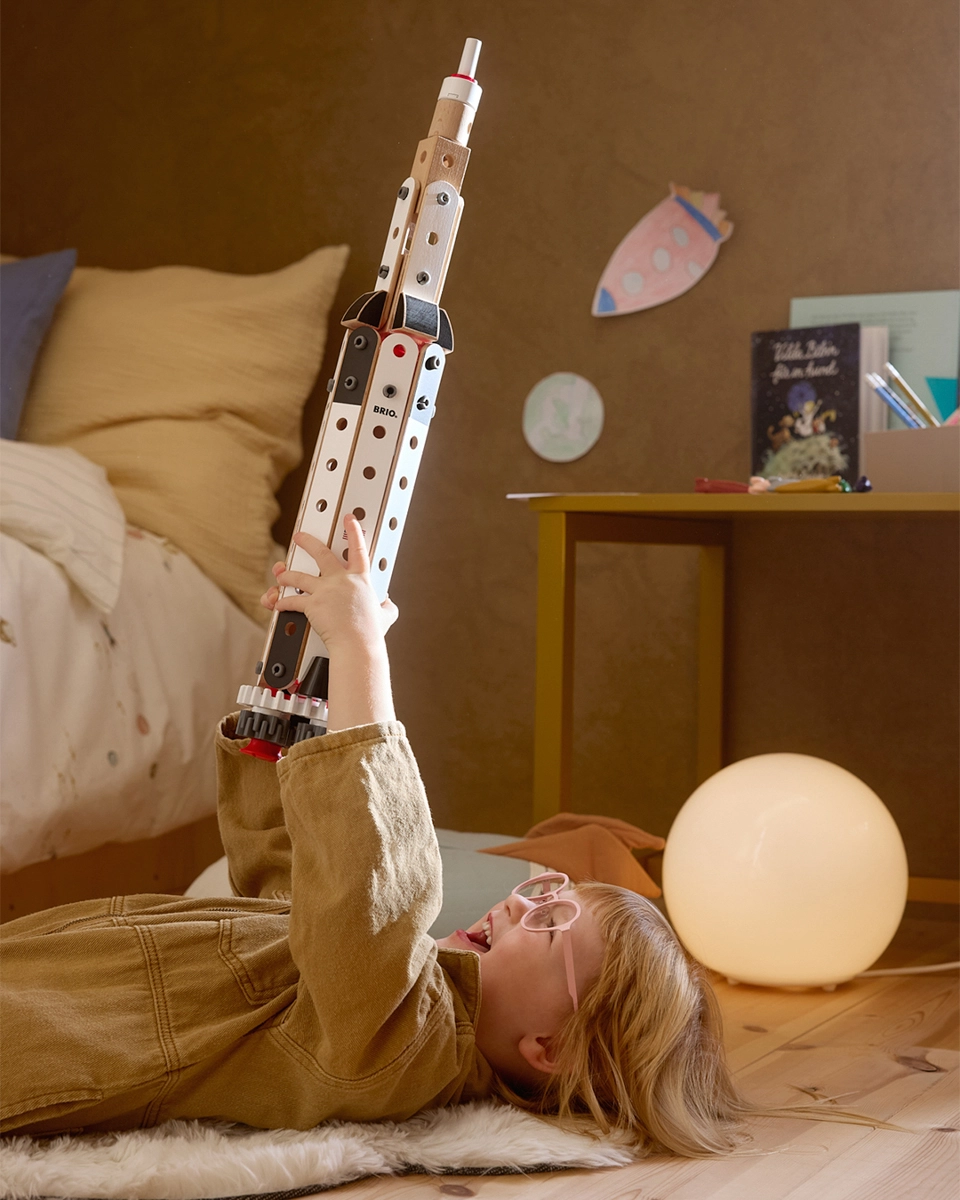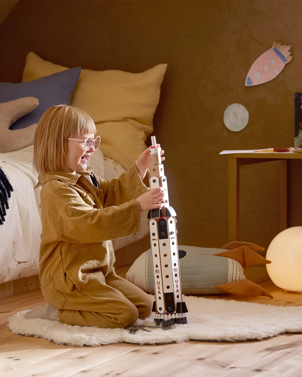 Odkrijte ikonično raketo NASA Apollo Saturn V v izvedbi kakovostnega konstrukcijskega seta BRIO Builder. Robustna kombinacija lesenih profilov in blokov s plastičnimi spojkami, zobniki in orodji podpira odprto igro, tehnične eksperimente in domišljijo. Tristopenjska zasnova z utripajočo konico otroke popelje v svet kozmonavtike in zgodb o osvajanju vesolja.