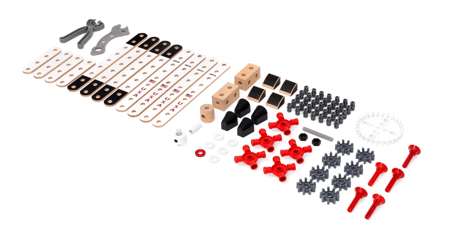 - 12× leseni profil, 11× leseni blok, 9× zobnik, 5× žebelj/spoj, 1× luč, 1× klešče, 1× ključ, različni igralni deli, 1× inspiracijski letak