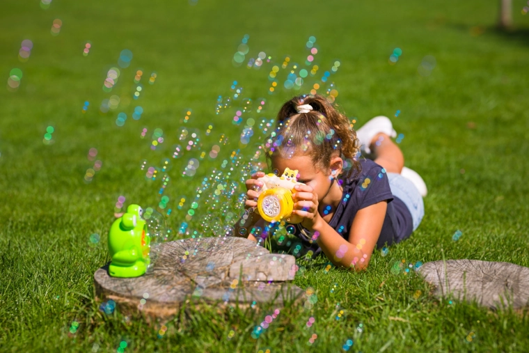 Lahka in prenosna zasnova, ki jo otroci vzamejo na vrt, v park ali na rojstnodnevne zabave. Pisani mehurčki pričarajo nasmeh kjerkoli.